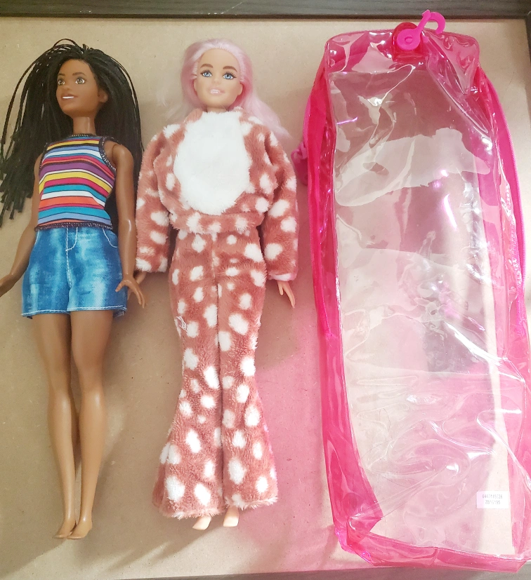 Hi, I have these 2 dolls for free. No shoes. Barbie with pink hair can change makeup under cold water/ice.