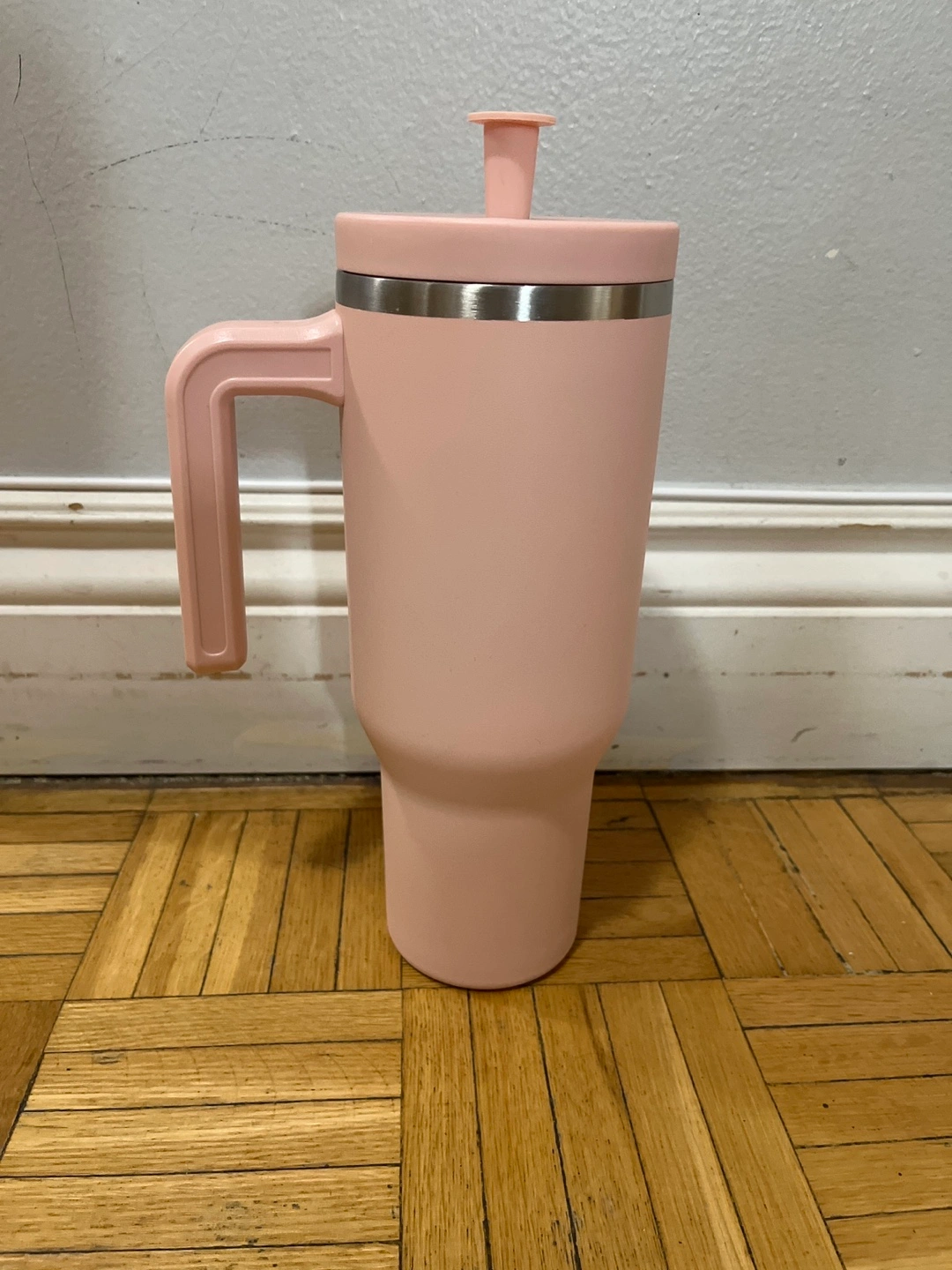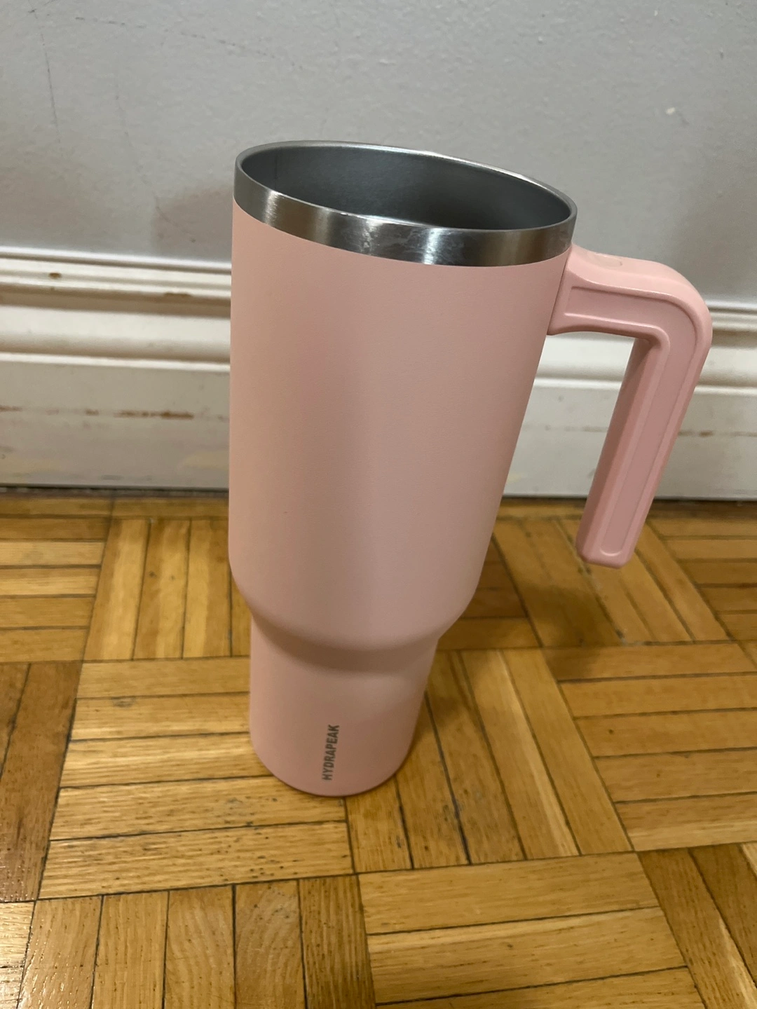 Large capacity travel mug. Keeps drinks hot or cold. Features a comfortable handle and a leak-proof lid. Durable, double-walled stainless steel construction. Perfect for commuting or outdoor adventures(No straw included)