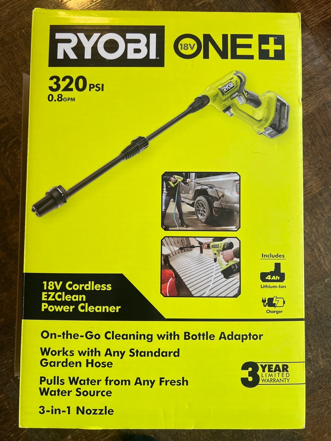 18V cordless power cleaner. 320 PSI, 0.8 GPM. On-the-go cleaning with bottle adaptor. Works with standard garden hose. Pulls water from any fresh water source. 3-in-1 nozzle. Includes 4Ah lithium-ion battery and charger. Brand new in box. Never used.