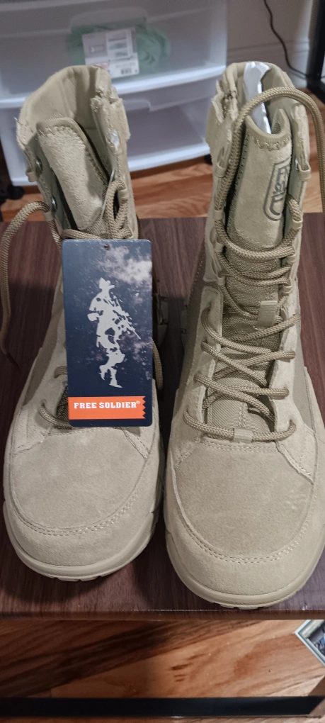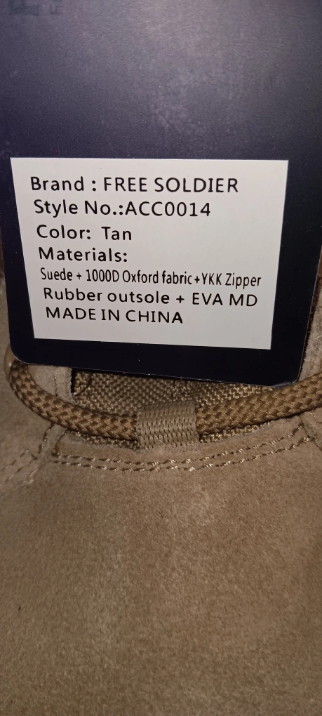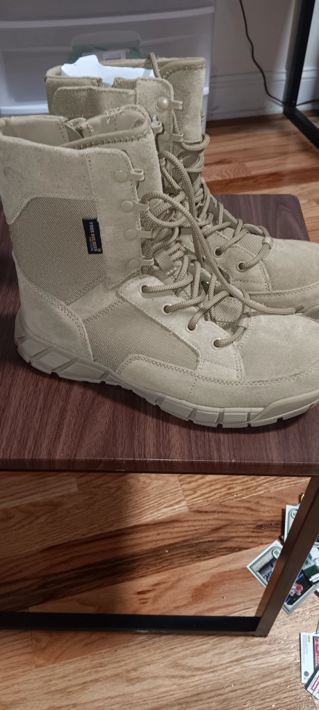 Men's tan tactical boots. Size US 8, UK 7, EUR 41. Suede and 1000D Oxford fabric upper. YKK zipper. Rubber outsole and EVA midsole. Made in China. New with tags.