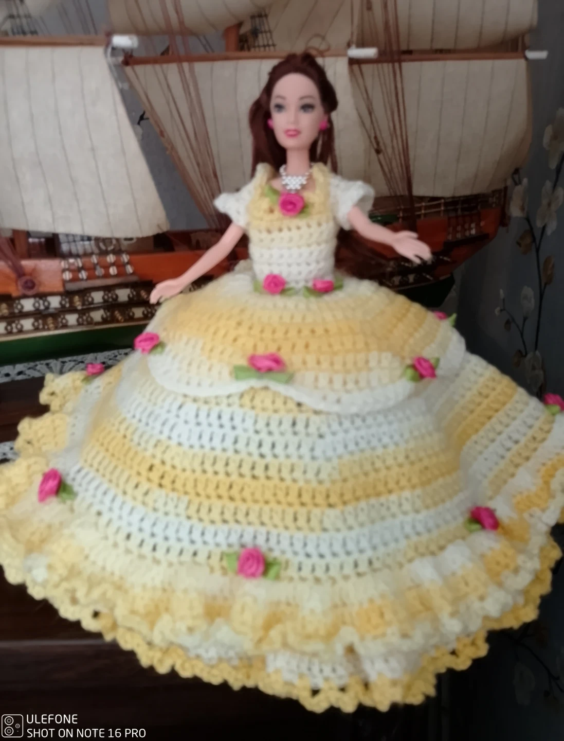 A handmade doll dress in yellow and white crochet with pink floral accents. It's designed to fit a standard fashion doll. The dress is approximately 10 inches long and has a full, ruffled hem. This is a lovely piece for any doll collection!