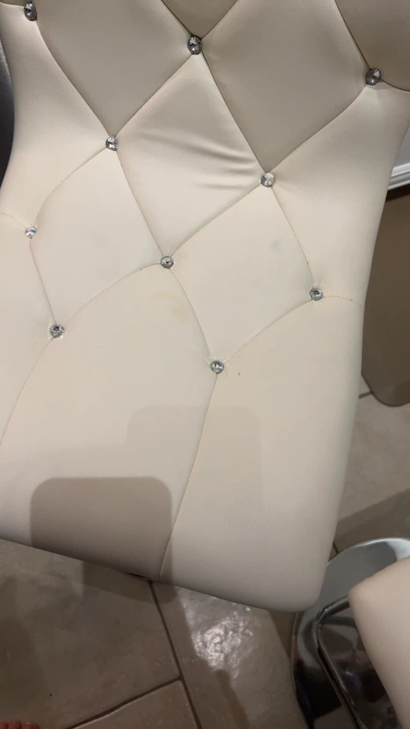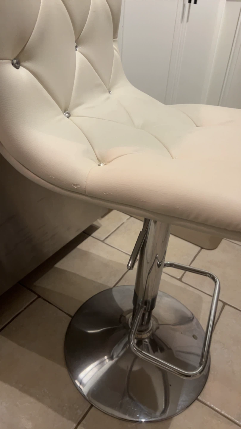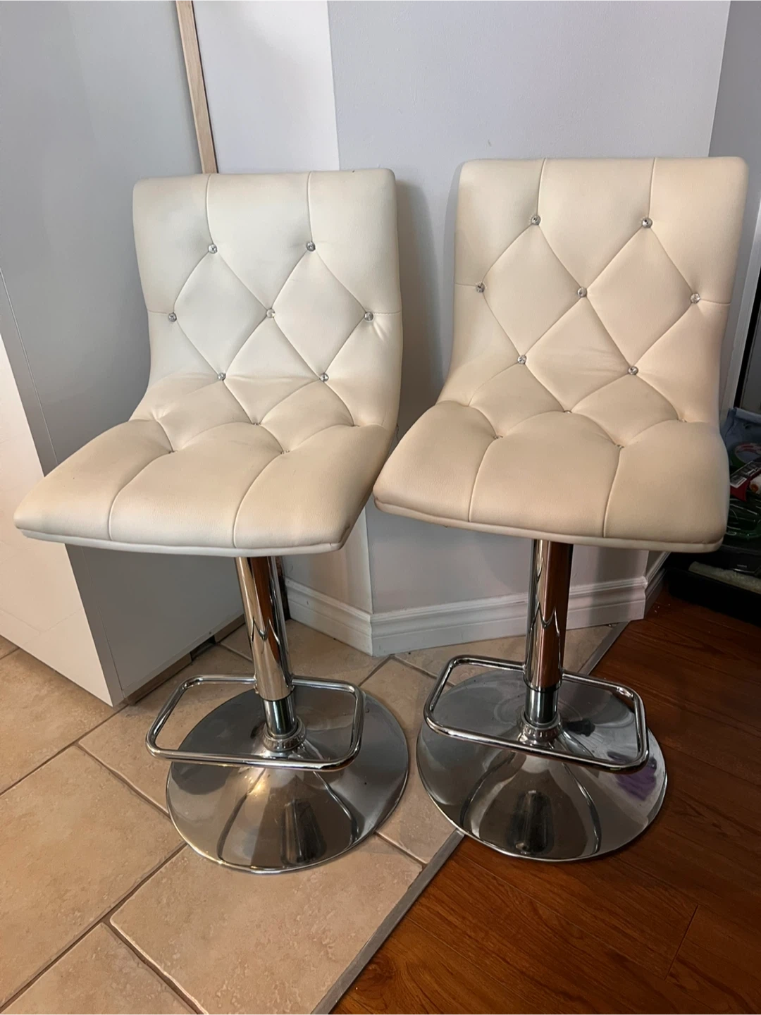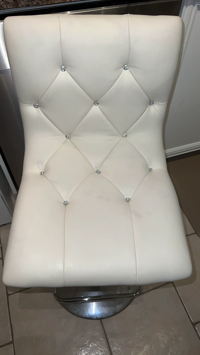 Selling a set of 2 stylish white bar stools with a chrome base. It has a diamond-tufted back and a comfortable padded seat. It shows some signs of wear, with a few small tears on the seat and back. Still sturdy and stylish for your kitchen or bar area! Price is per chair.