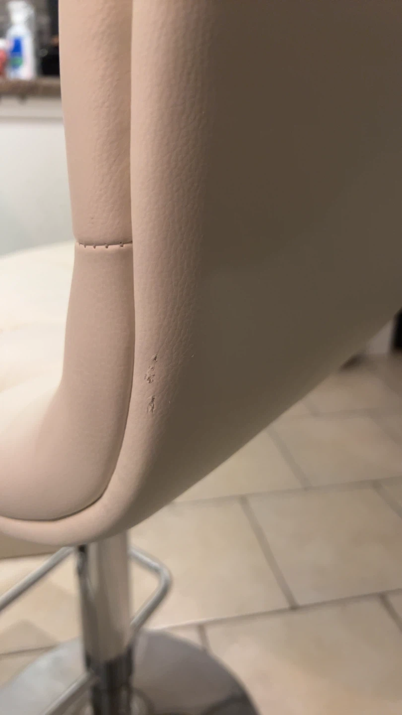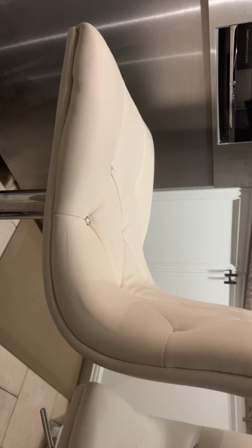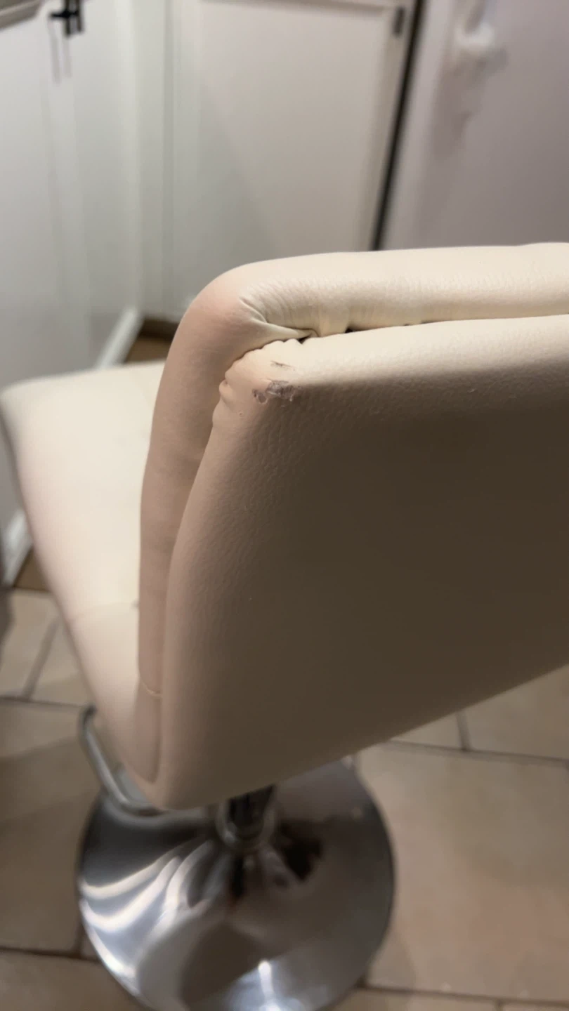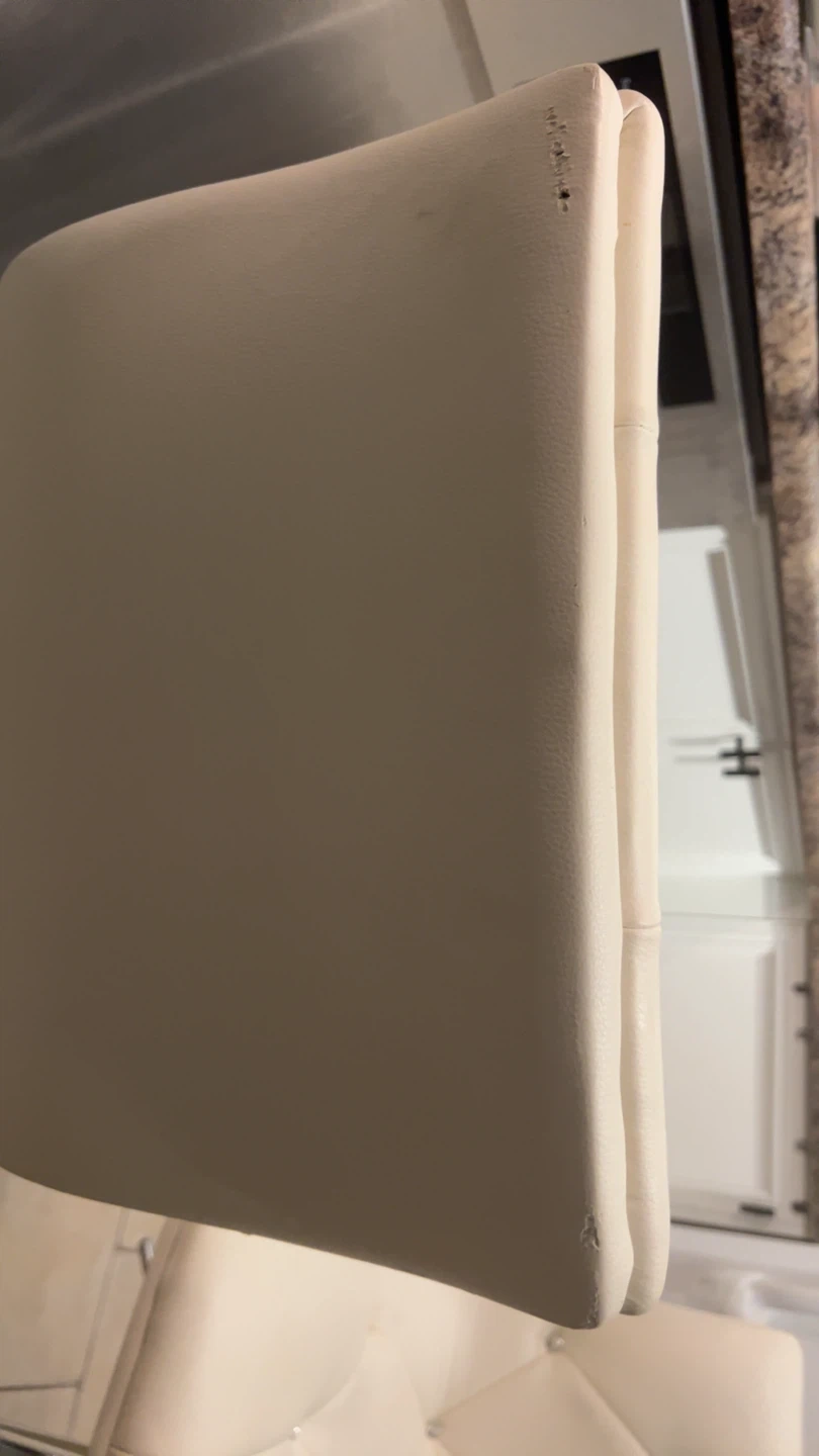 Selling a set of 2 stylish white bar stools with a chrome base. It has a diamond-tufted back and a comfortable padded seat. It shows some signs of wear, with a few small tears on the seat and back. Still sturdy and stylish for your kitchen or bar area! Price is per chair.