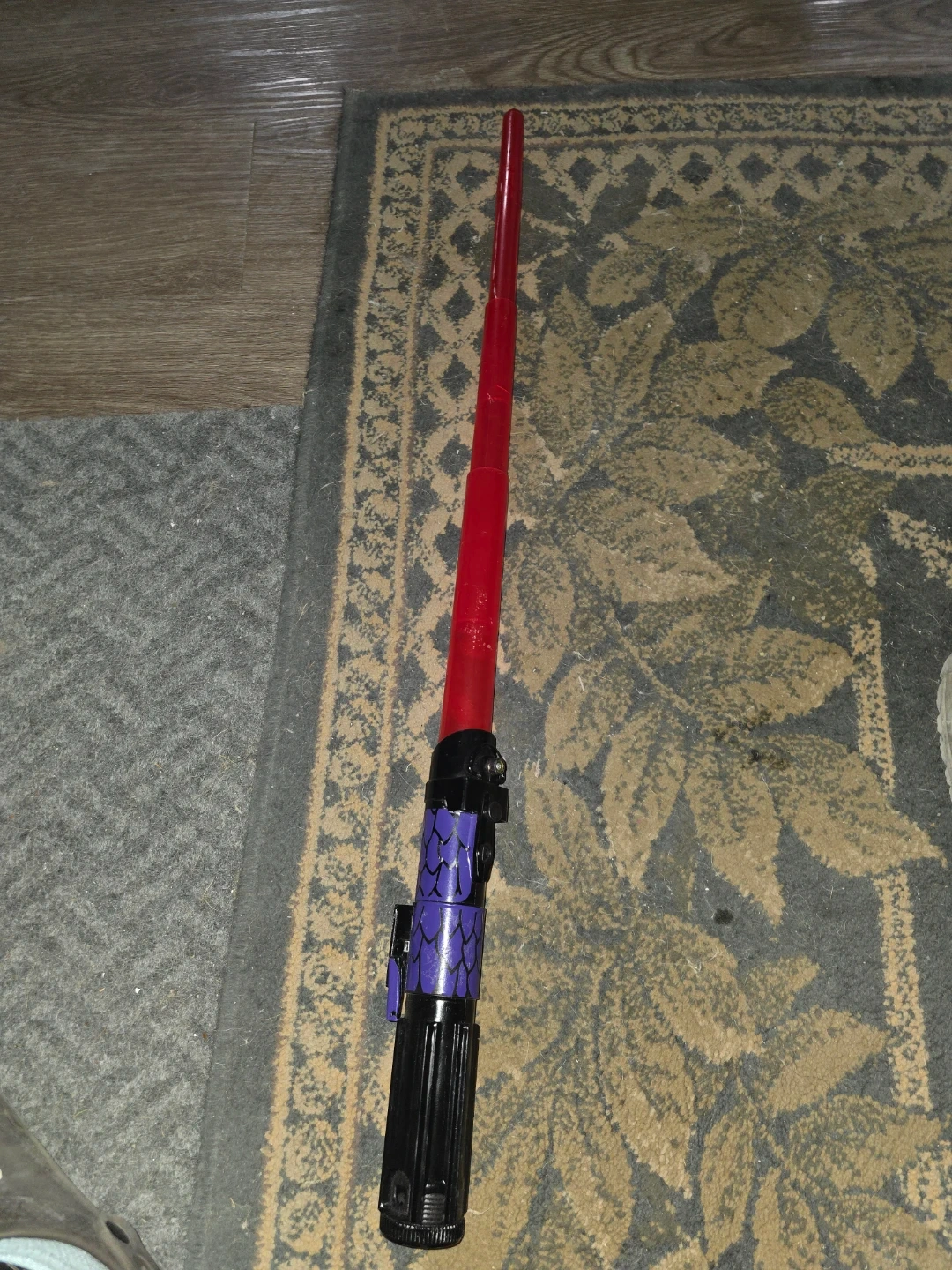 A fun red lightsaber toy for playtime. It's black and purple at the hilt with a retractable red blade. Makes for a great prop or for imaginative play!