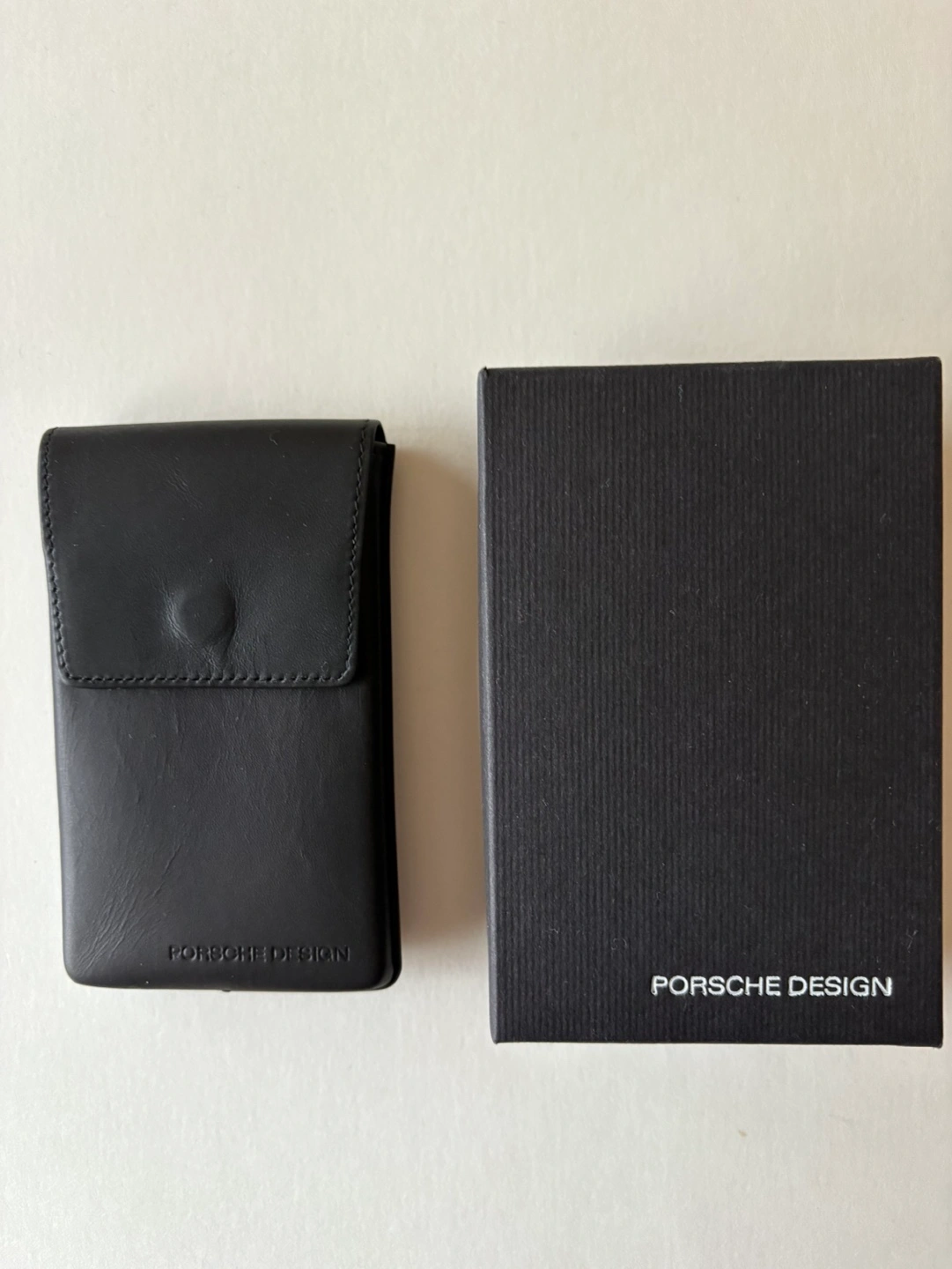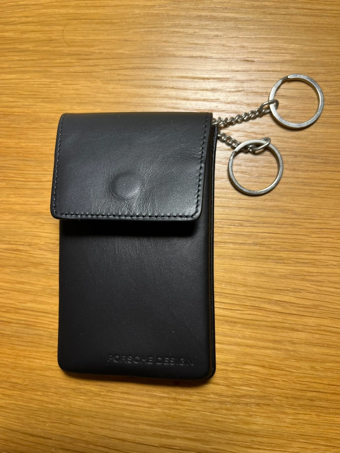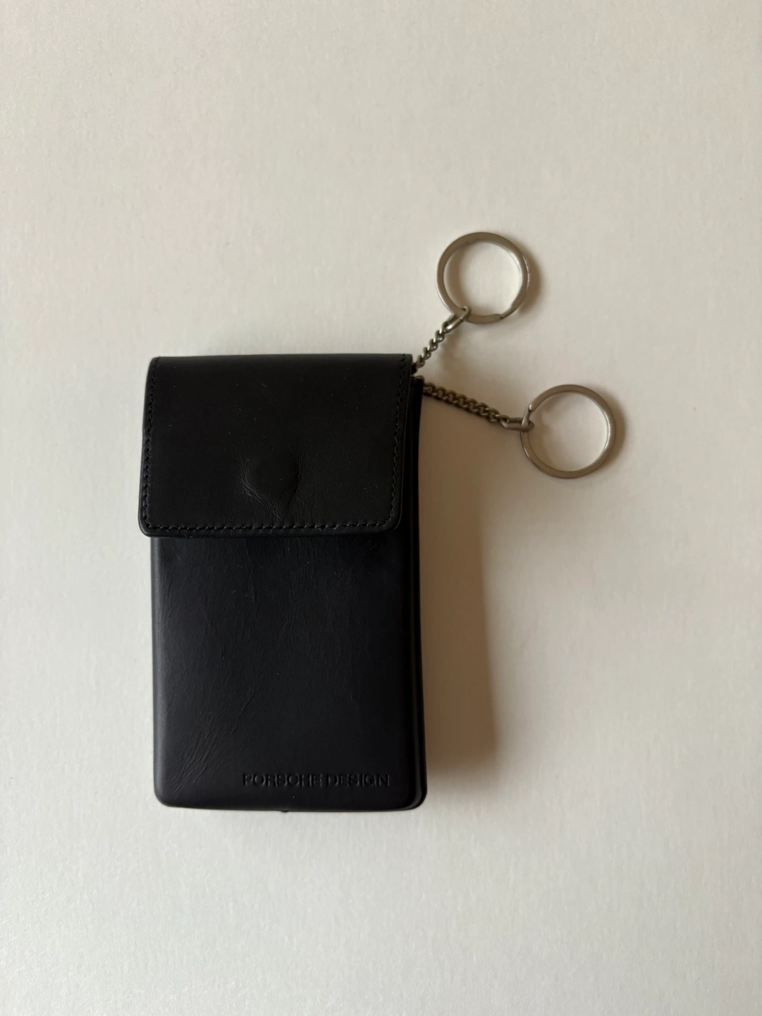 New black leather key case. Features a small flap and two key rings. Compact and stylish. Great for daily use.