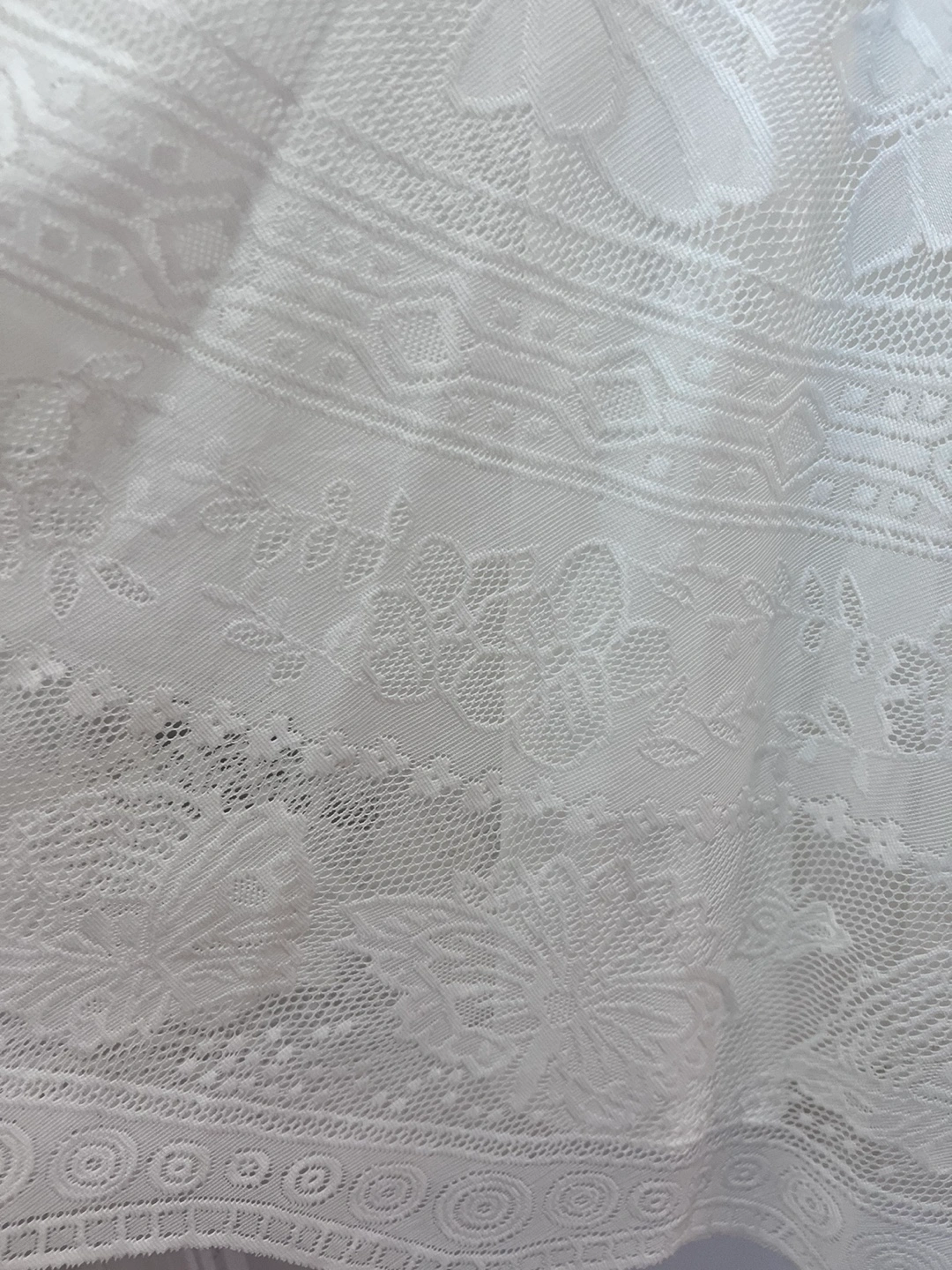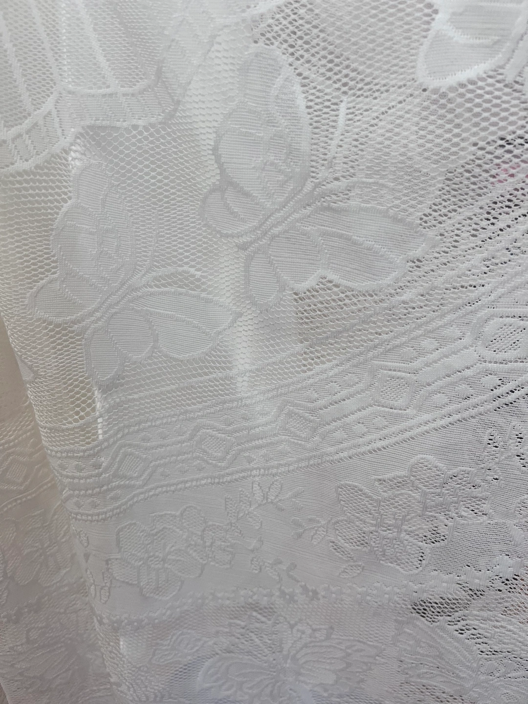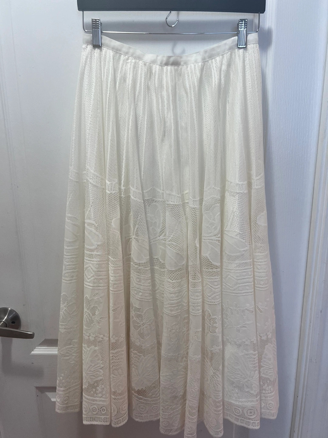 112Elegant white lace midi skirt. Features a beautiful floral pattern. A-line silhouette. Fully lined. Perfect for special occasions. 27 inches around waist 32 inches long.