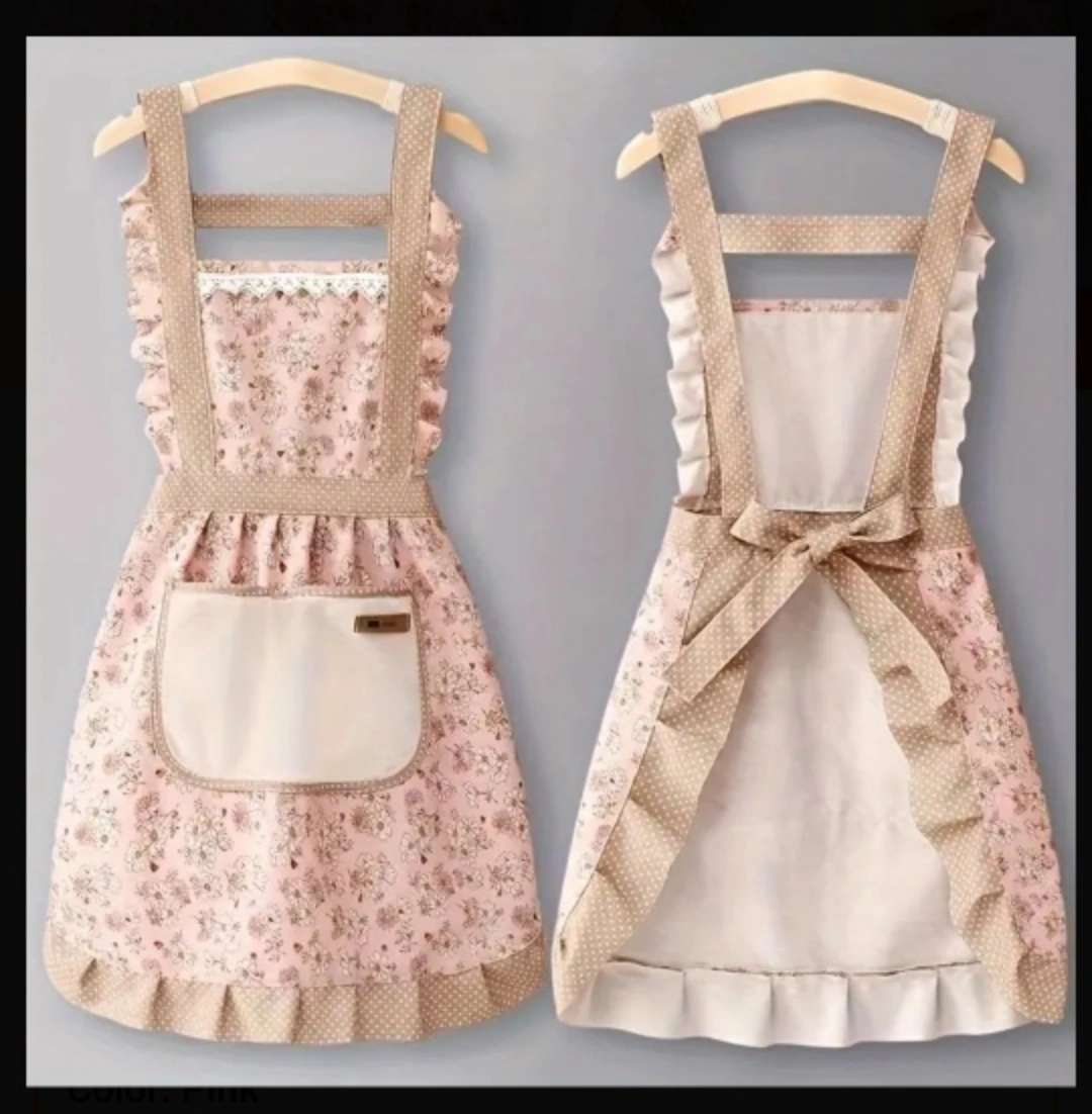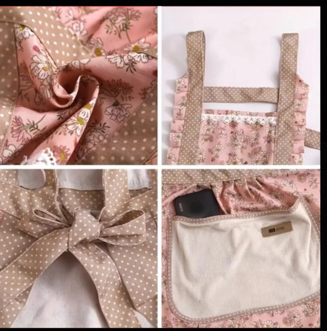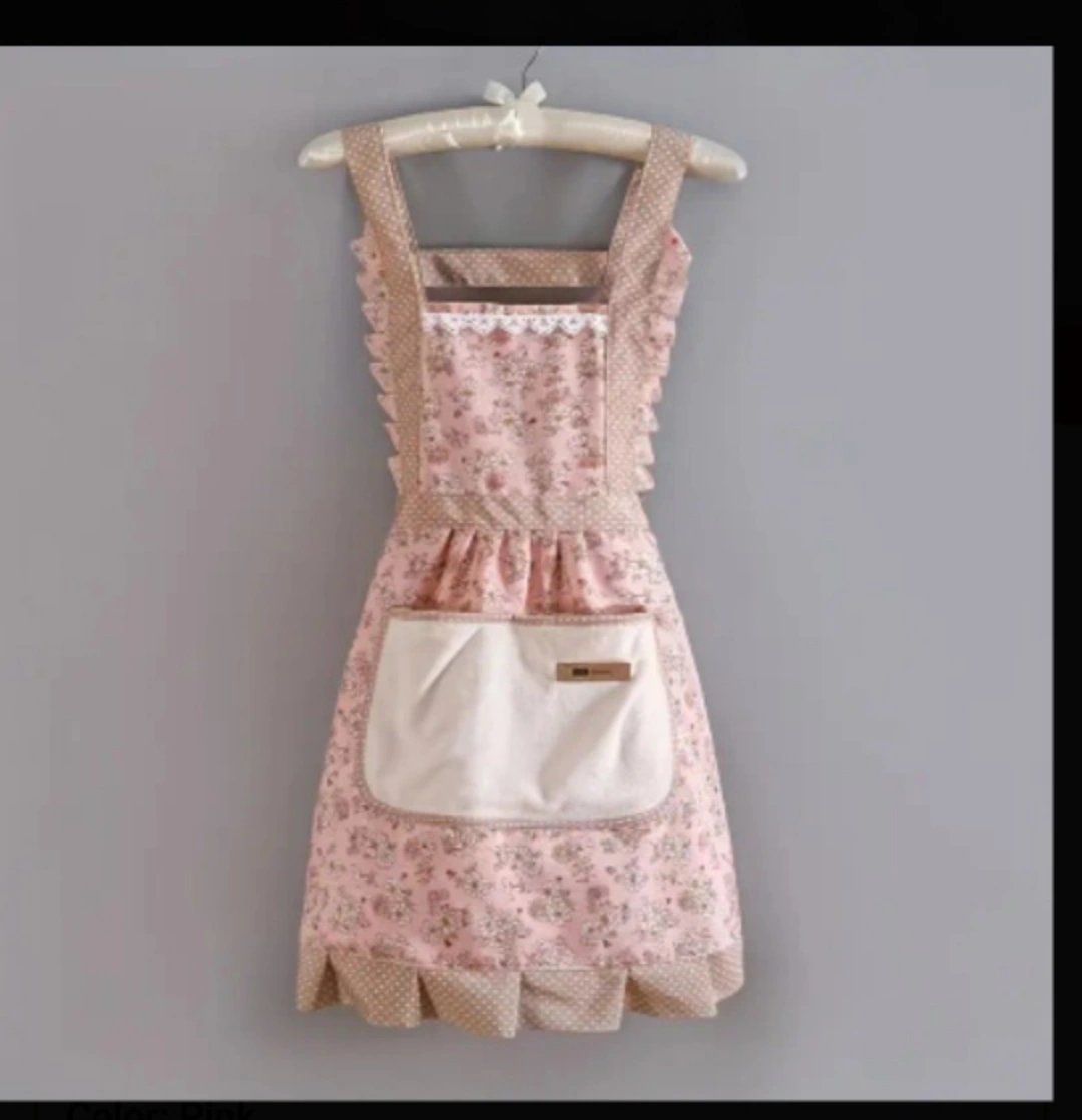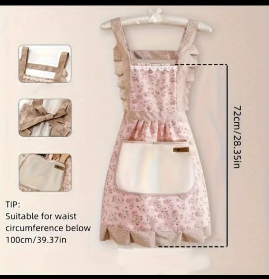 Pretty pink and beige floral apron. Features ruffles, a large pocket, and a tie-back. Suitable for Kitchen, Living Room, Bathroom Cleaning
