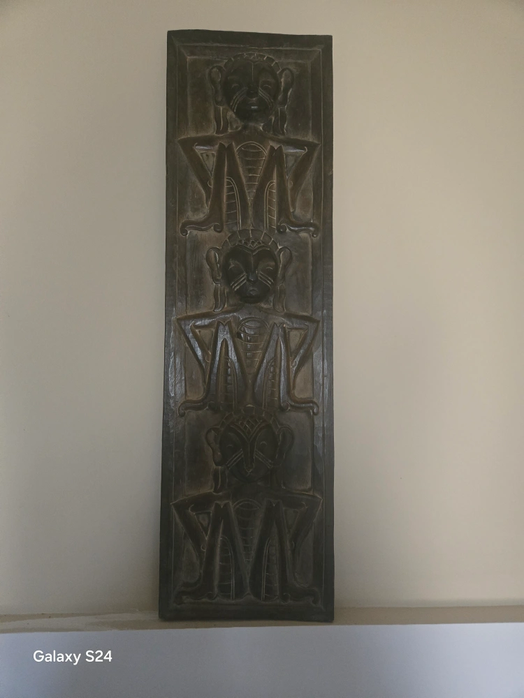 Dark brown wood wall décor. Features three repeating carved figures. Unique and eye-catching piece. Adds character to any room.