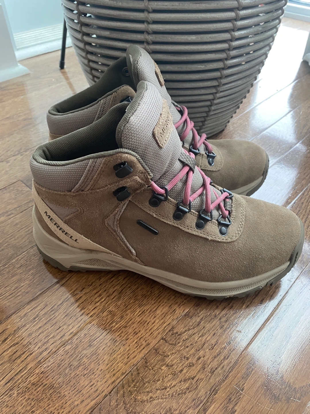 Women's Merrell hiking boots. Size 8 but runs small. Fits more like 7.5. Tan suede with pink laces. Waterproof. Great condition. Used twice. Pick up only in North York area