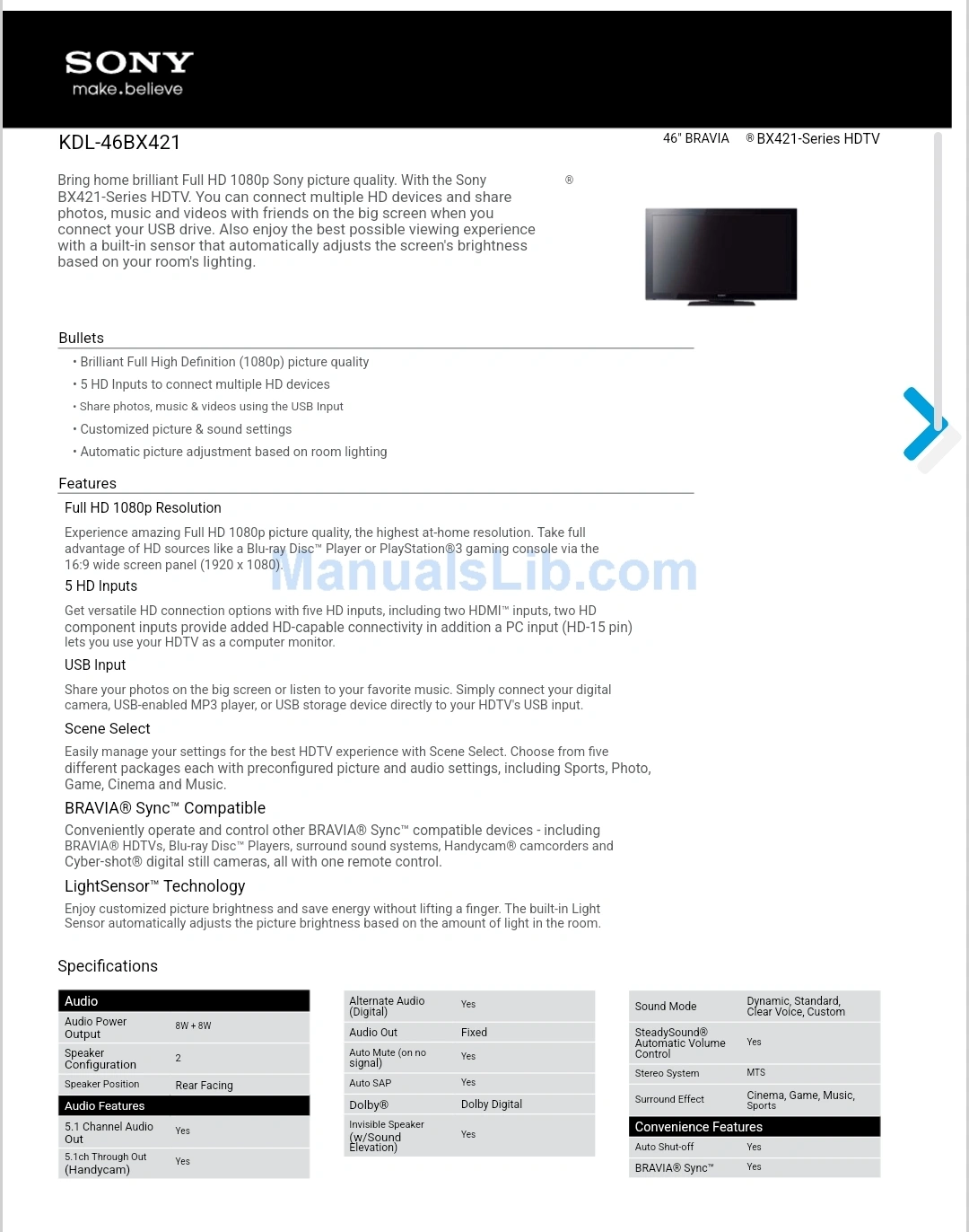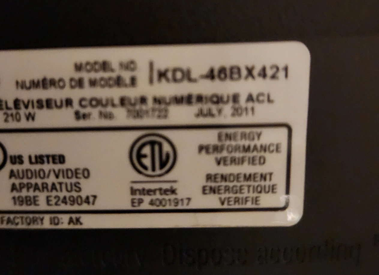 46" Sony Bravia TV - Model KDL-46BX421