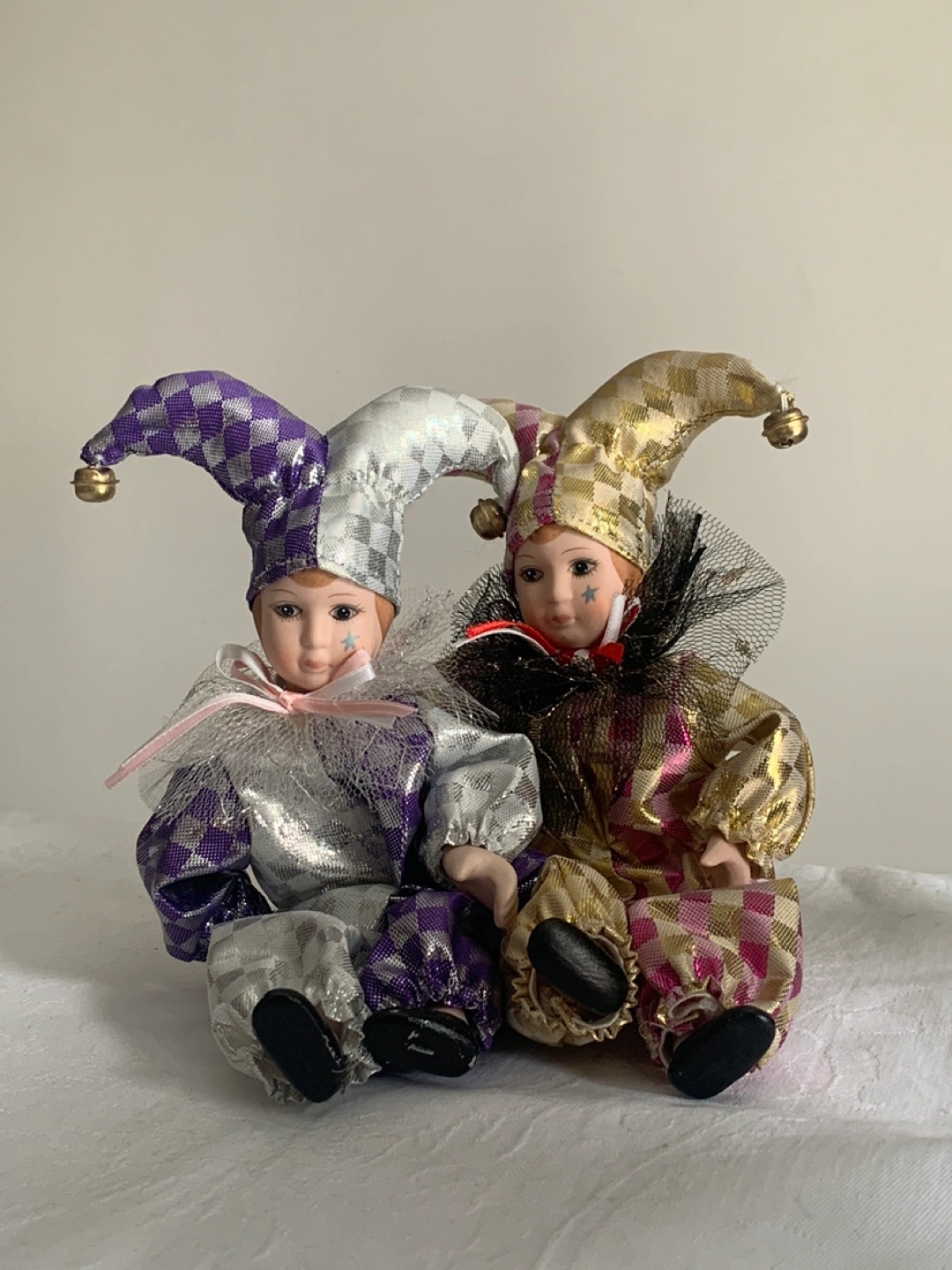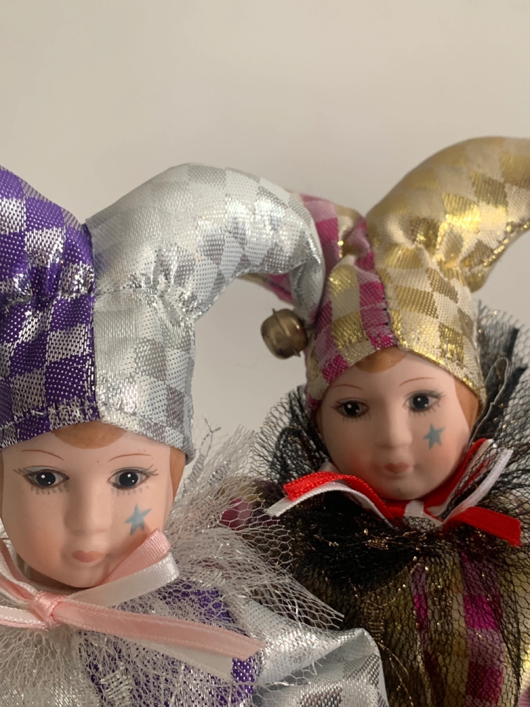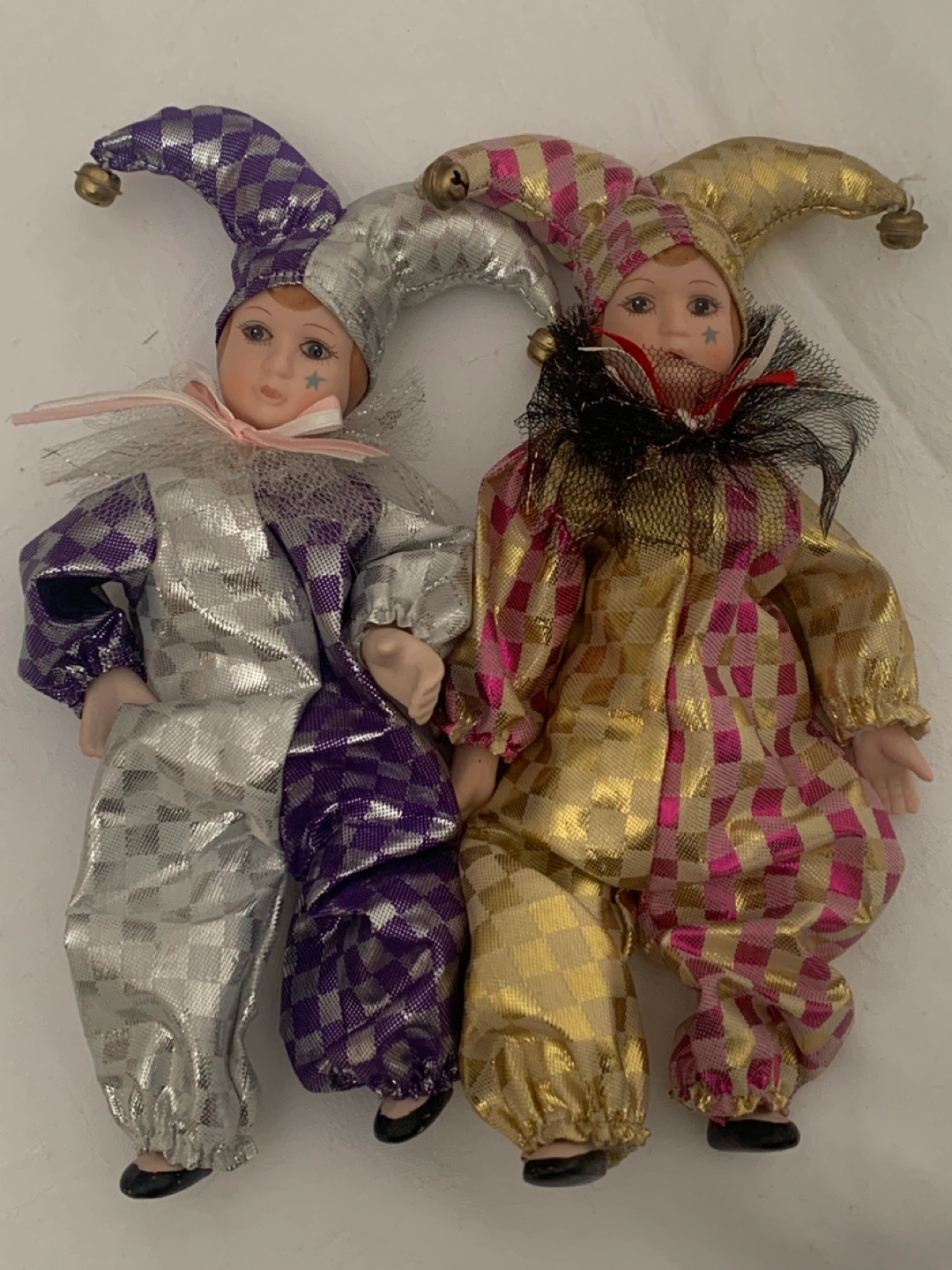 Two jester clowns for 5 dollar. Featuring delicate ceramic faces, hands and feet. Star detailing on the cheeks.