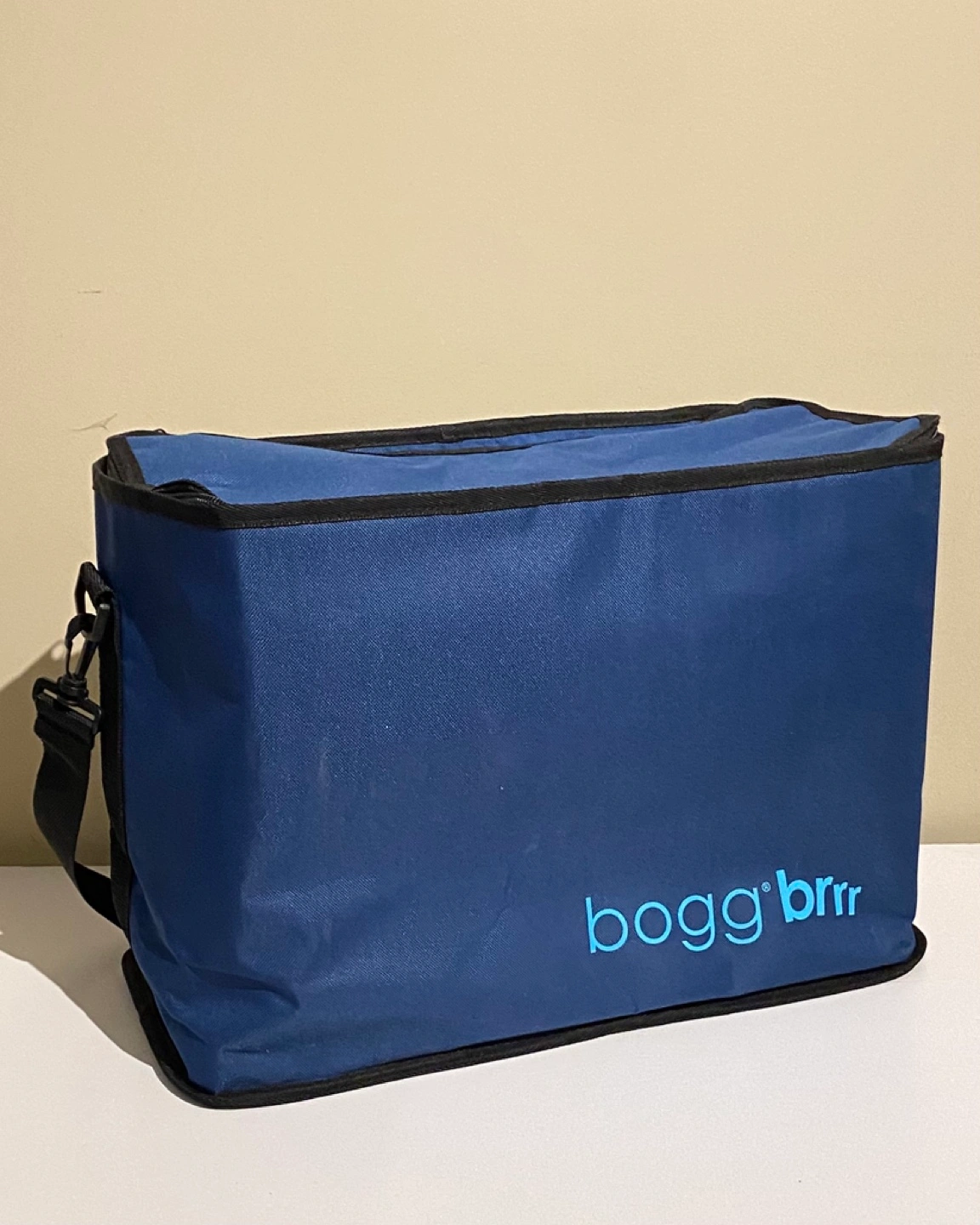 Blue insulated cooler bag with zipper closure and shoulder strap. Perfect for picnics or transporting food. Brand new, never used. Measures 18” x 9” x 13”.