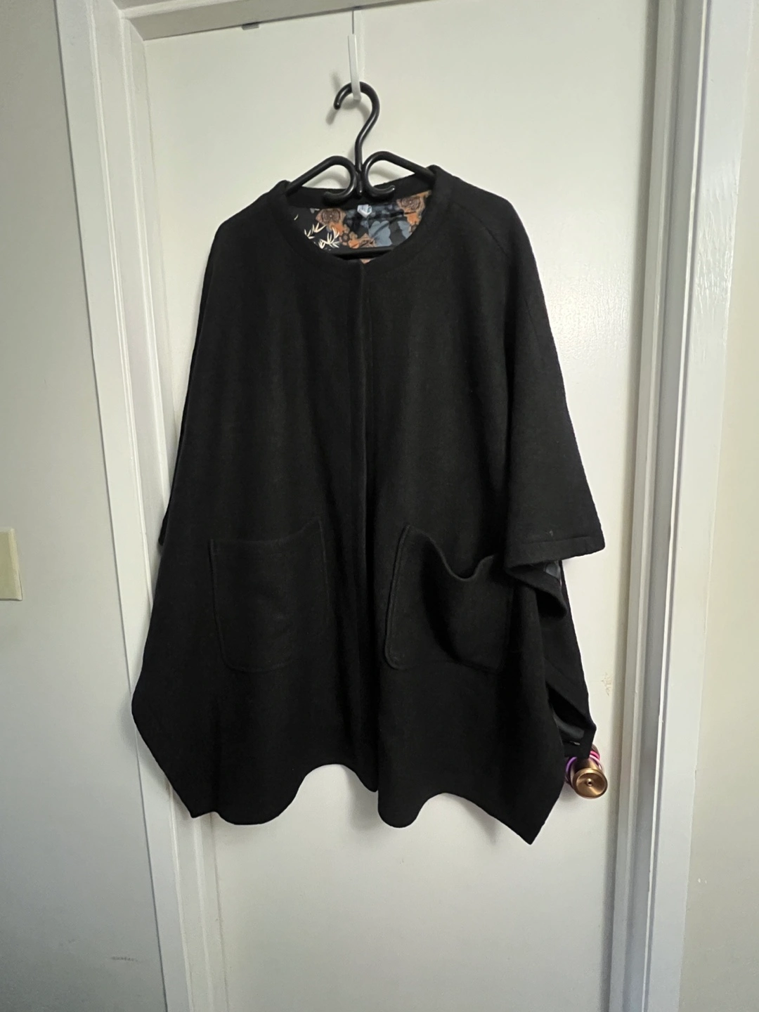 Brand new, never worn. Warm black wool poncho. Features pockets and a colourful floral lining. Relaxed fit. Great for fall and winter. Pick up only