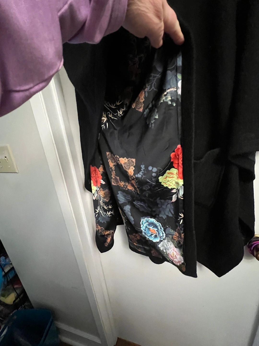 Black wool poncho with floral lining