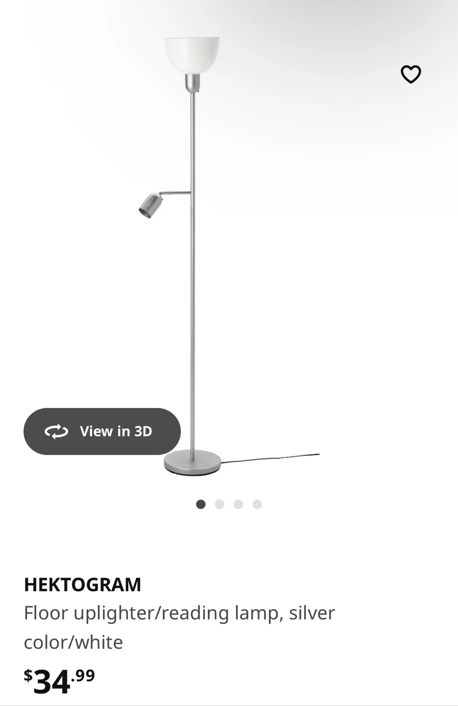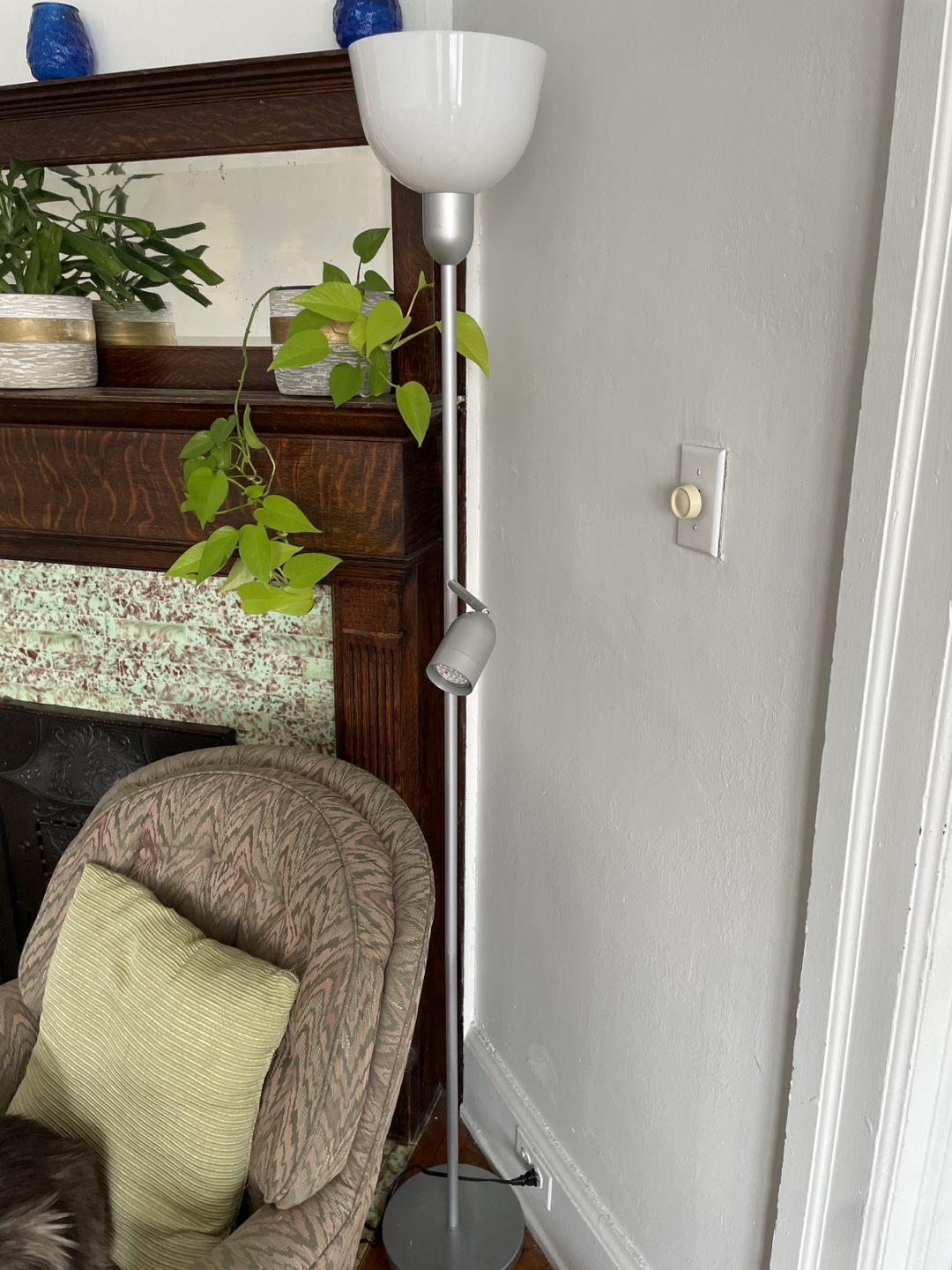 Stylish floor lamp with adjustable spotlight. Silver metal finish, white shade. Great for reading or ambient lighting. Used condition.