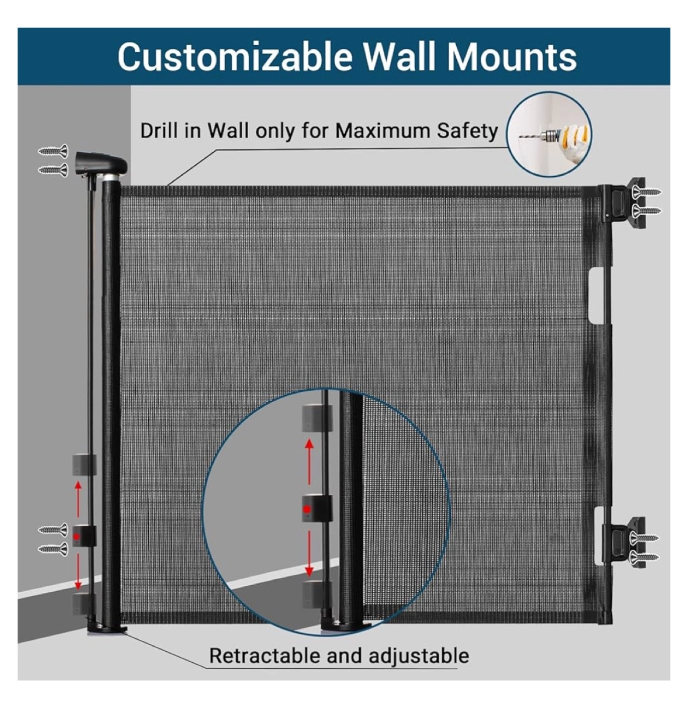 Black retractable safety gate. Wall mounted. Adjustable width. For child safety.