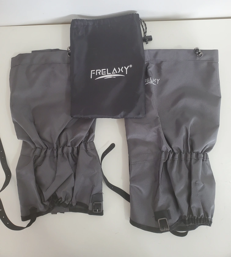 Pair of grey FRELAXY gaiters. 900D Oxford fabric. Waterproof and breathable. Lightweight design. Includes carrying bag. Strong rubber instep straps. Excellent for hiking and outdoor activities.