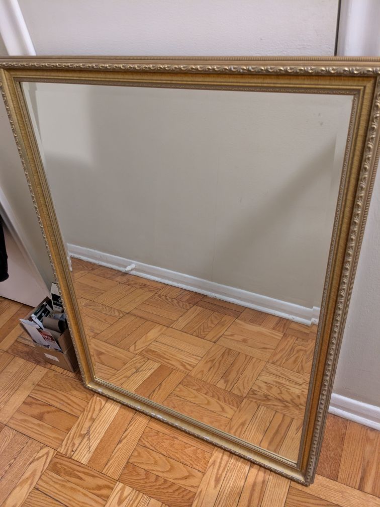 Ornate gold frame. Minor paint chipping as shown in second photo. . Large rectangular mirror. Perfect for a bedroom or entryway. It's 41 inches in length and 31 inches wide.
