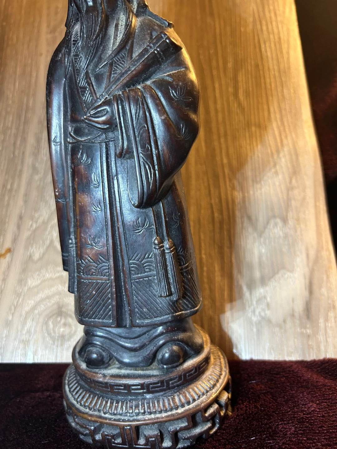 Intricately carved dark statue. Depicts a Chinese scholar in traditional robes. Features detailed clothing and facial features. Stands on a small base. Shows some age and wear.