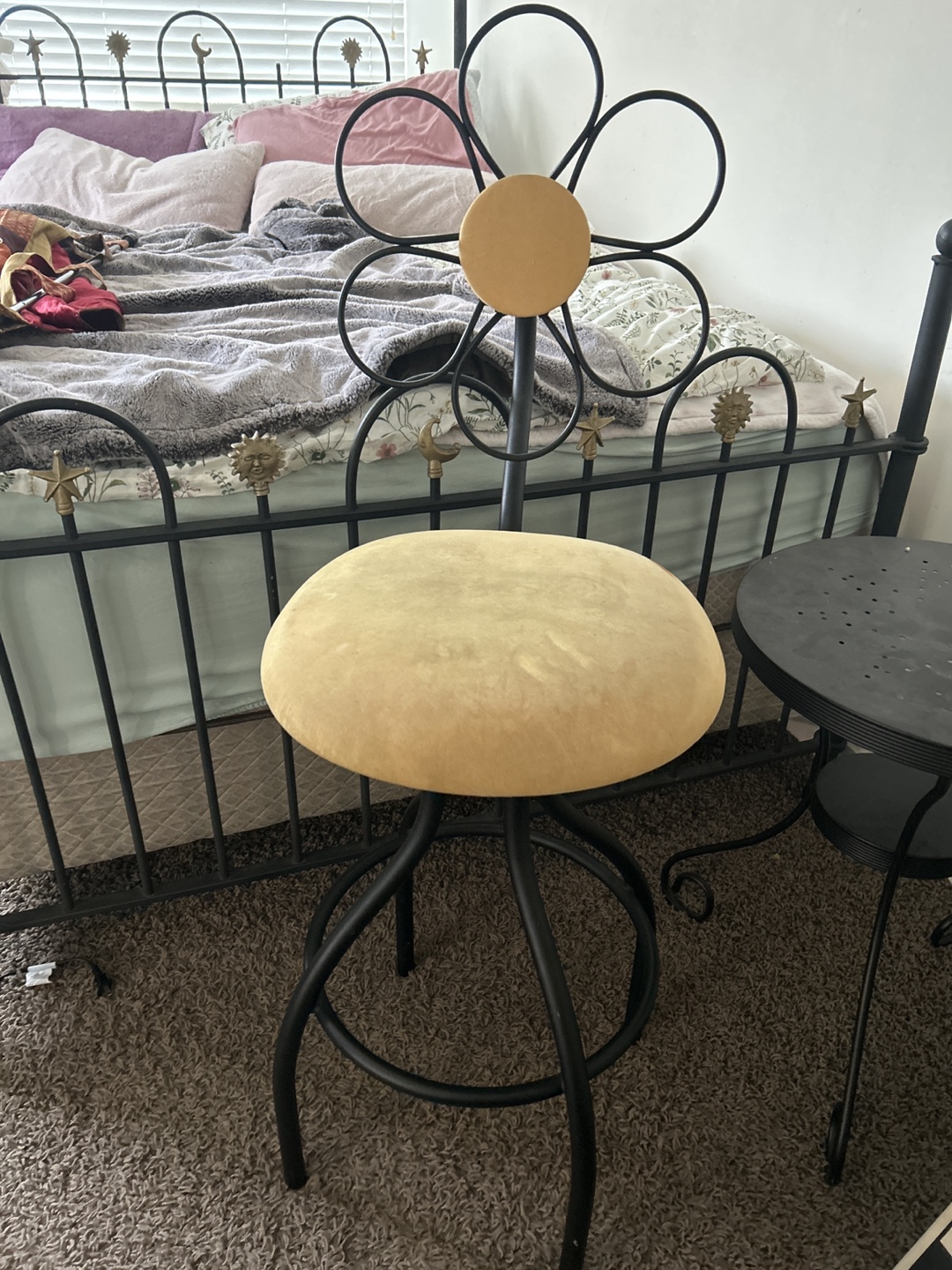 Black metal bar stool. Round, yellow cushioned seat. Flower-shaped backrest. Stylish and quirky.