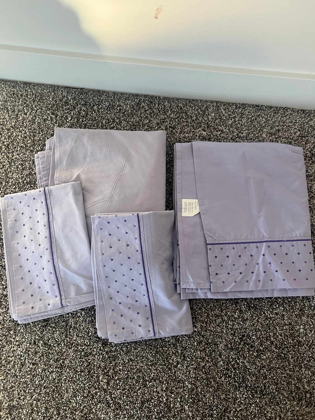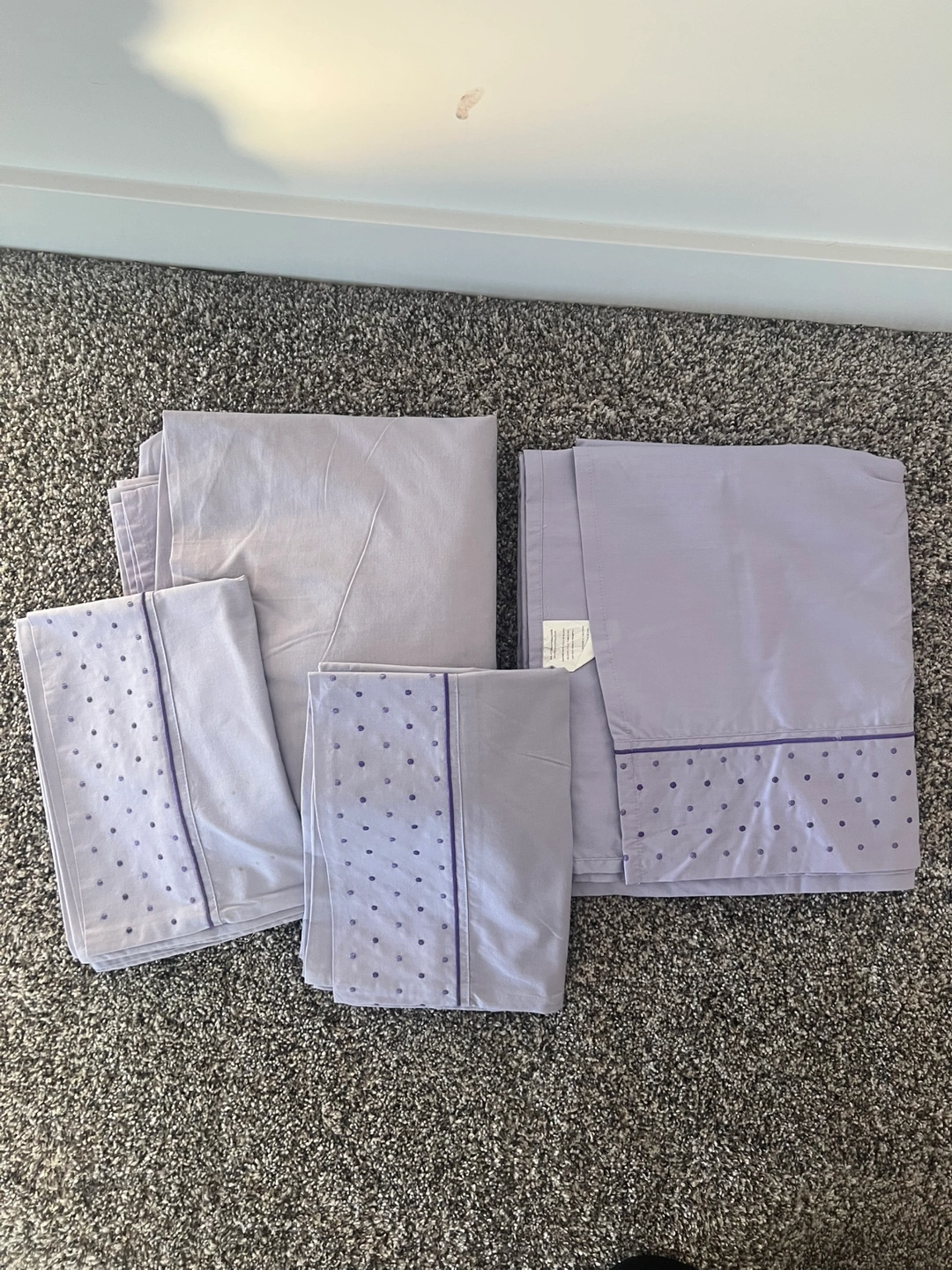 Lovely lavender double bed sheet set. Features small purple polka dots and a thin purple stripe along the bottom of each pillowcase and fitted sheet. Includes flat sheet, fitted sheet, and two pillowcases.