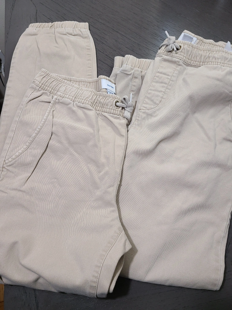Pair of beige Old Navy boys' joggers. Elastic waistband with drawstring. Good used condition. Size 14-16