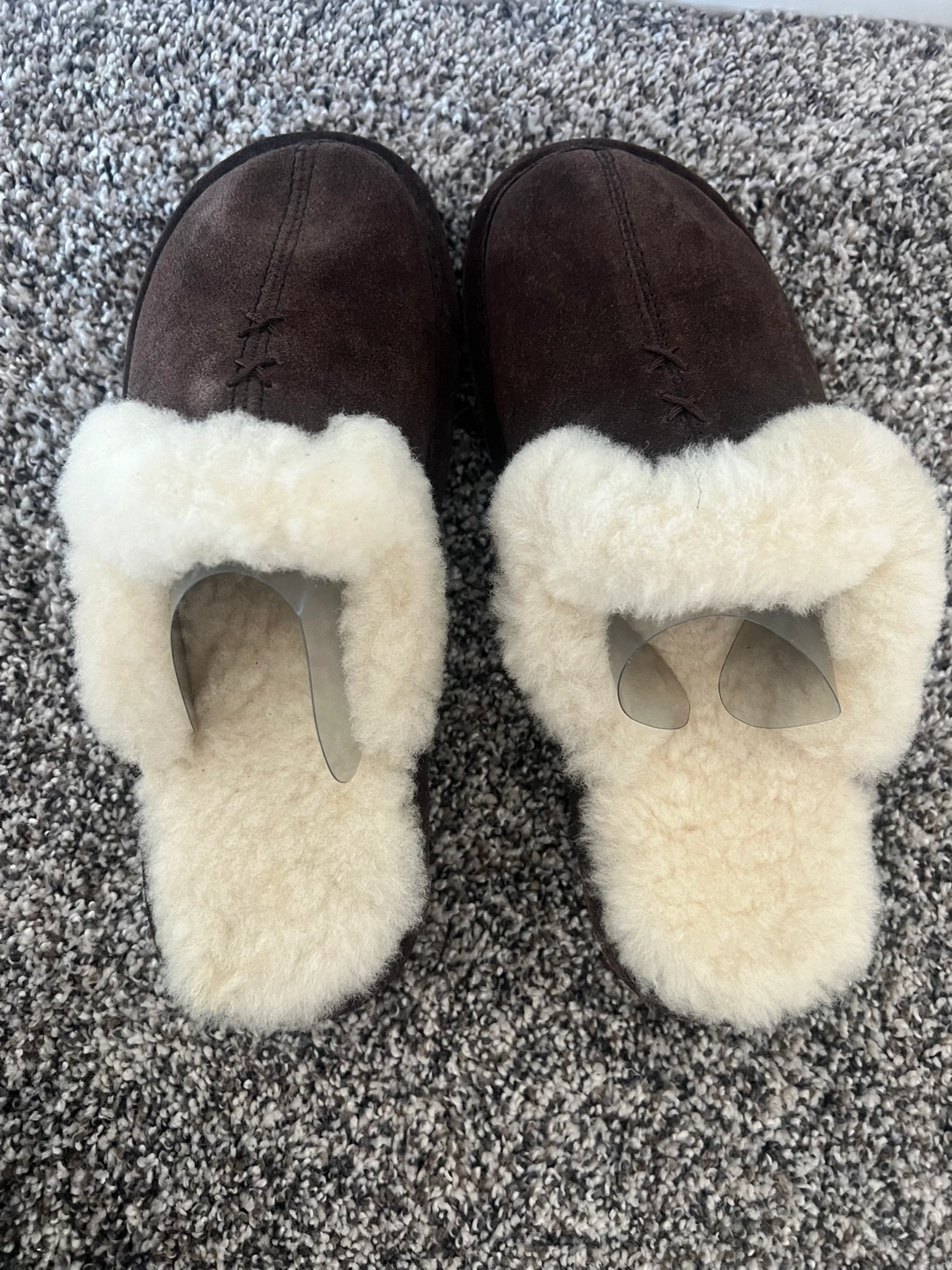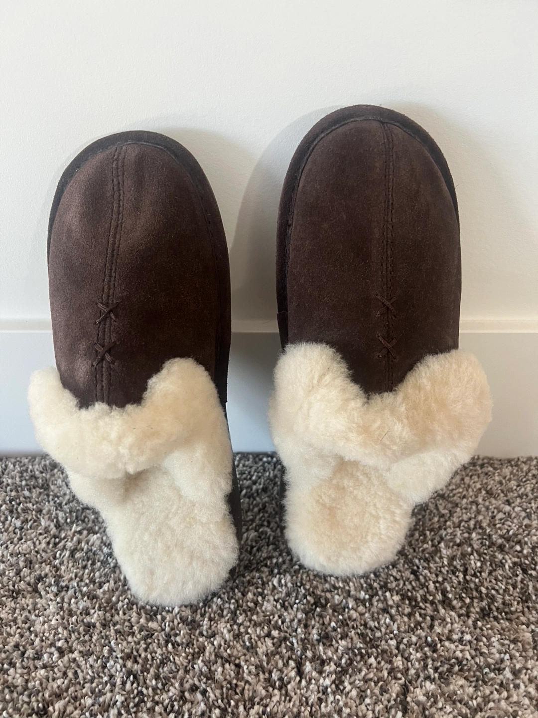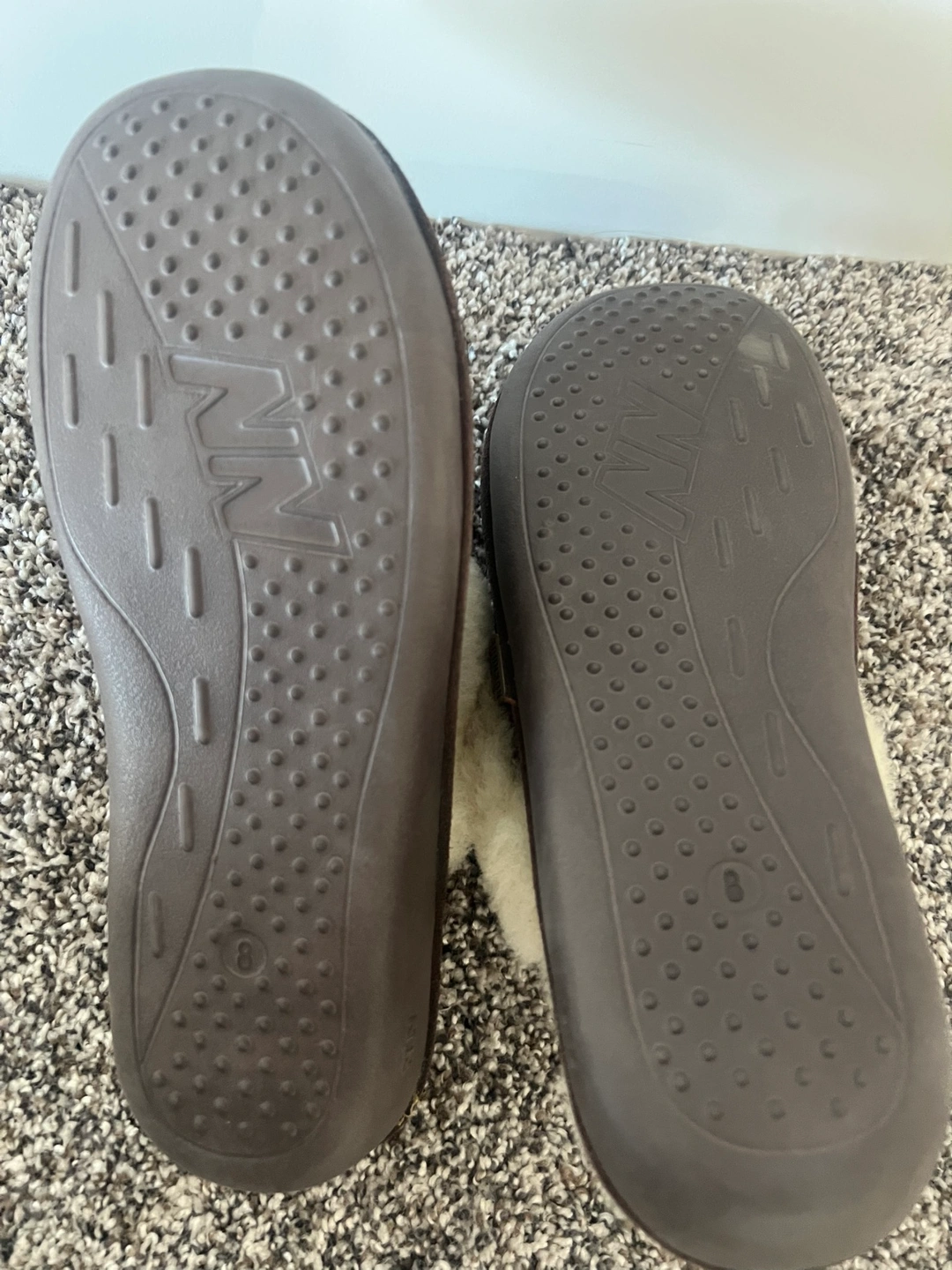 Brand new Nuknuuk Warm and comfortable sheepskin slippers. Brown suede exterior and fluffy cream interior. Size 8. Non-slip soles. Original price for $60. Selling for half price $30