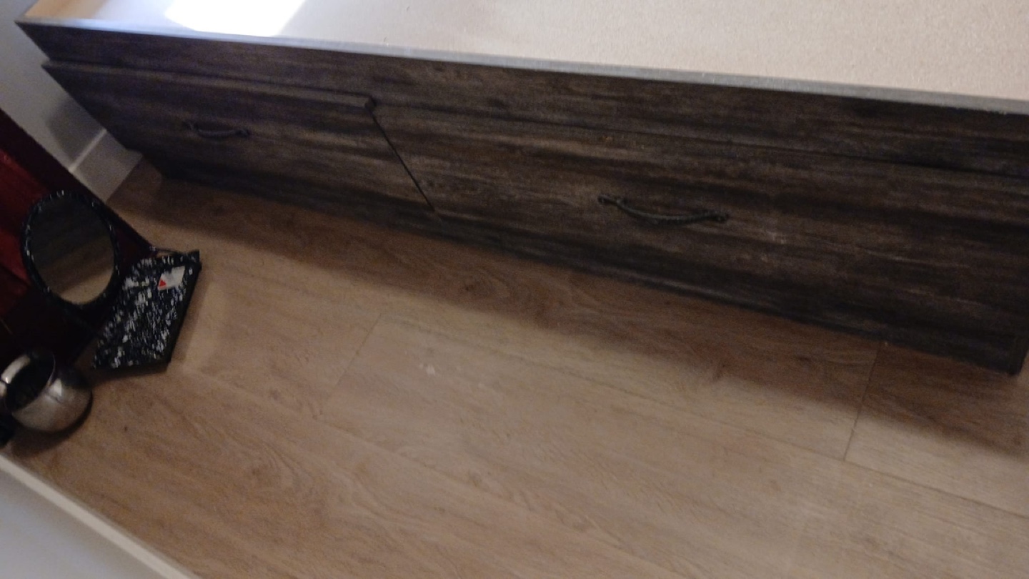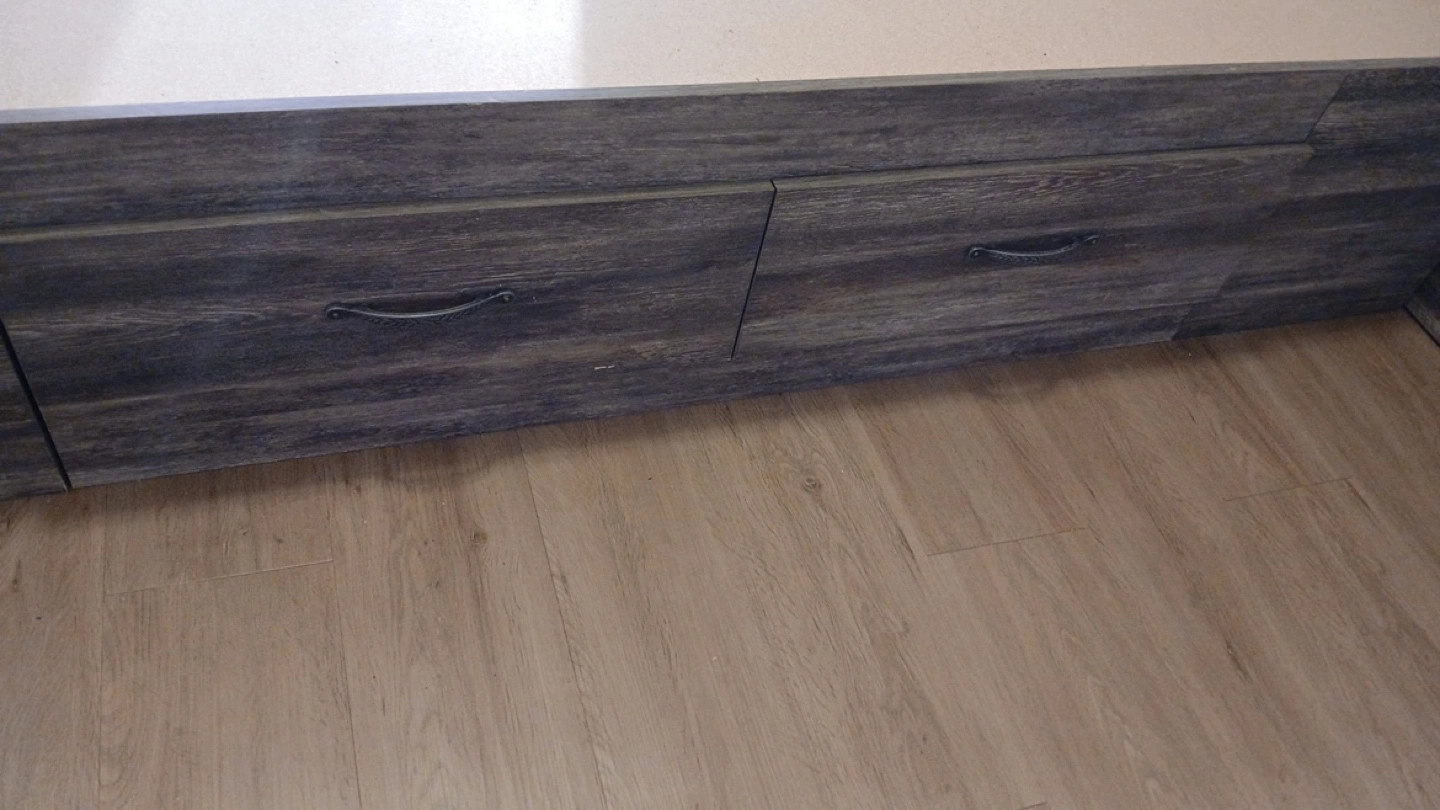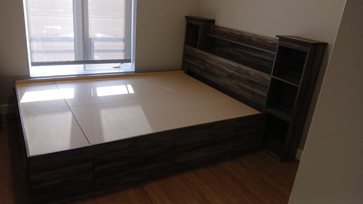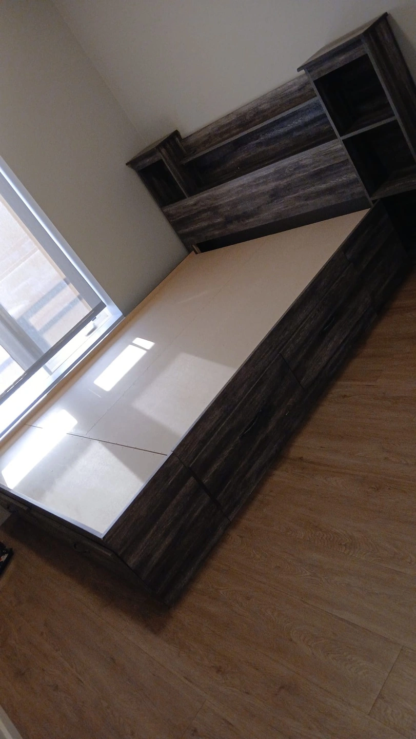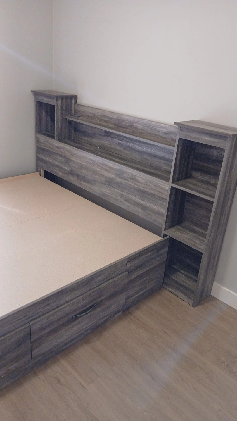 Dark grey wood grain finish. Queen-size bed frame. Built-in storage drawers underneath. Headboard features built-in shelving. Excellent for small spaces.