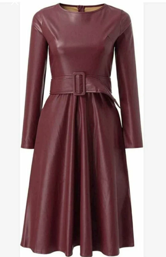 brand New Long-sleeved burgundy faux leather midi dress. Features a belted waist and a skater skirt. Elegant and stylish in wearing.