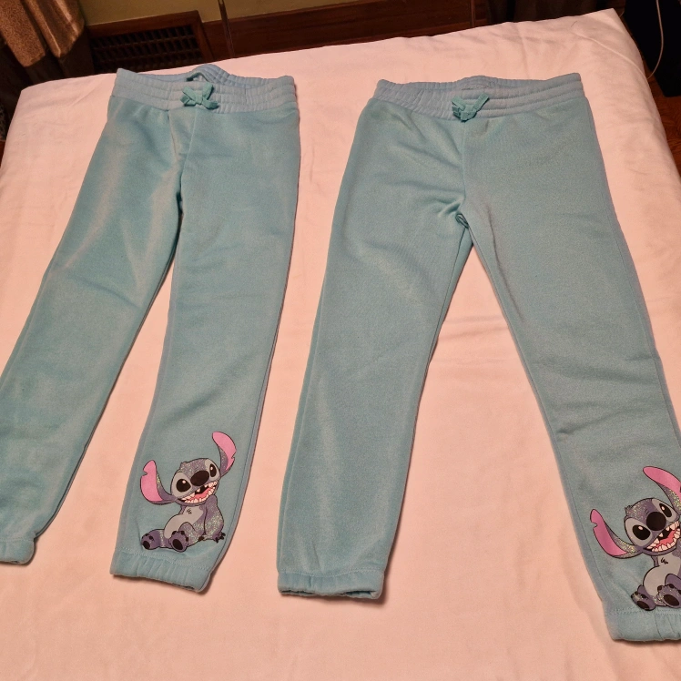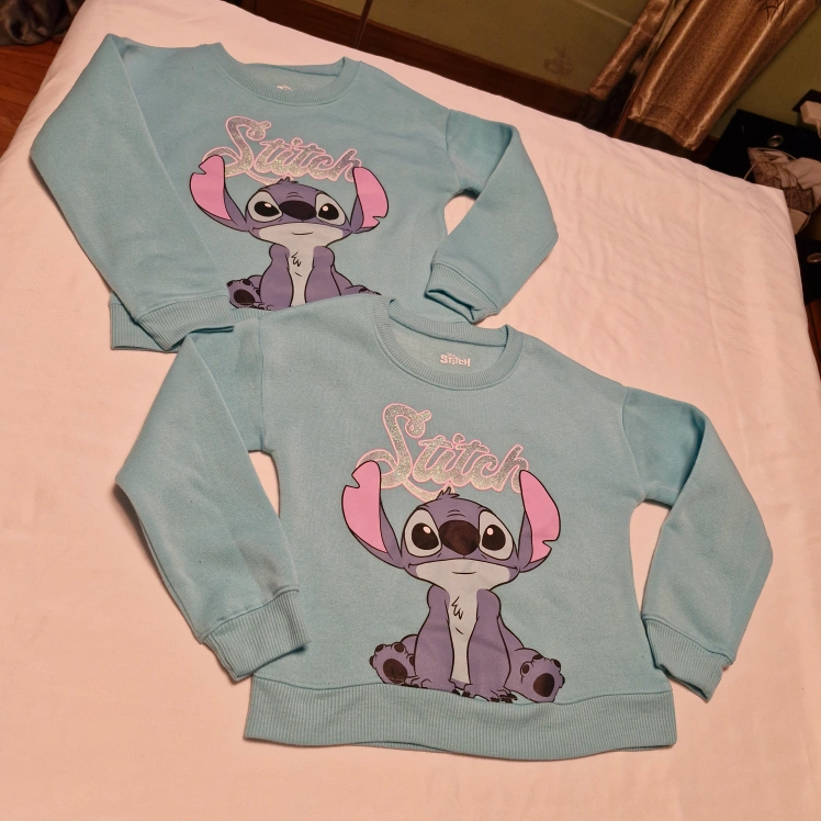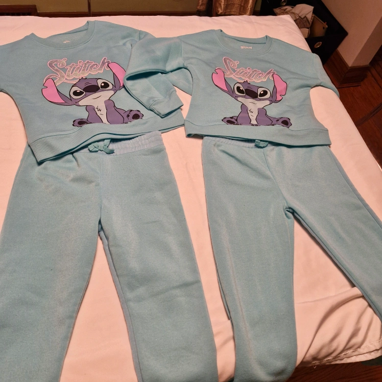 Two matching teal Stitch loungewear sets. Each includes a sweatshirt and sweatpants. Features a cute Stitch graphic. Great for lounging or playtime.