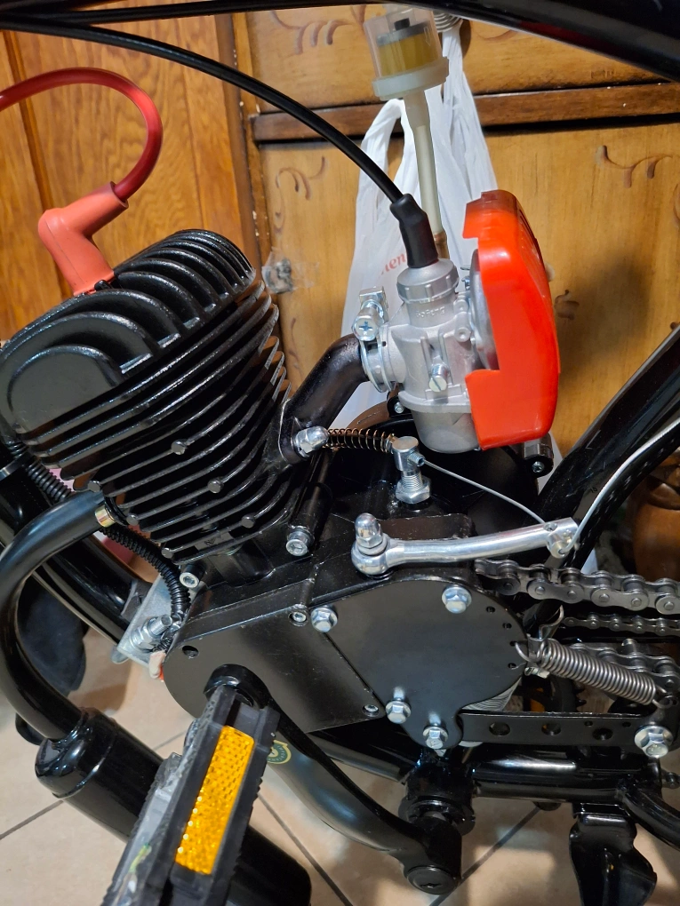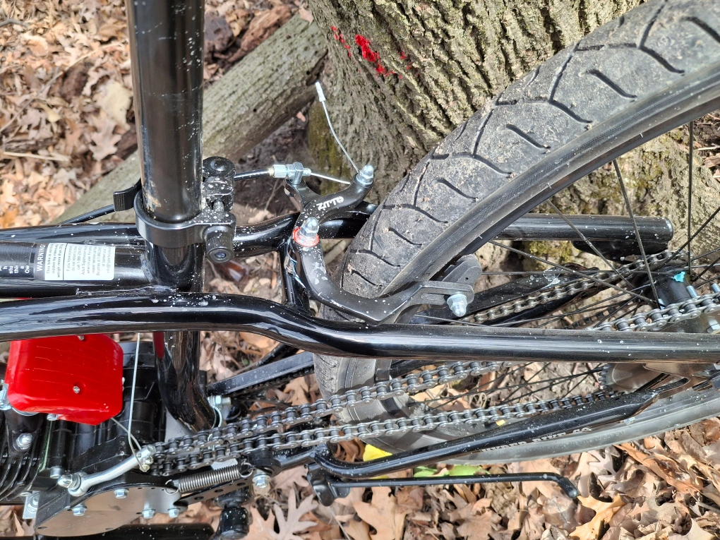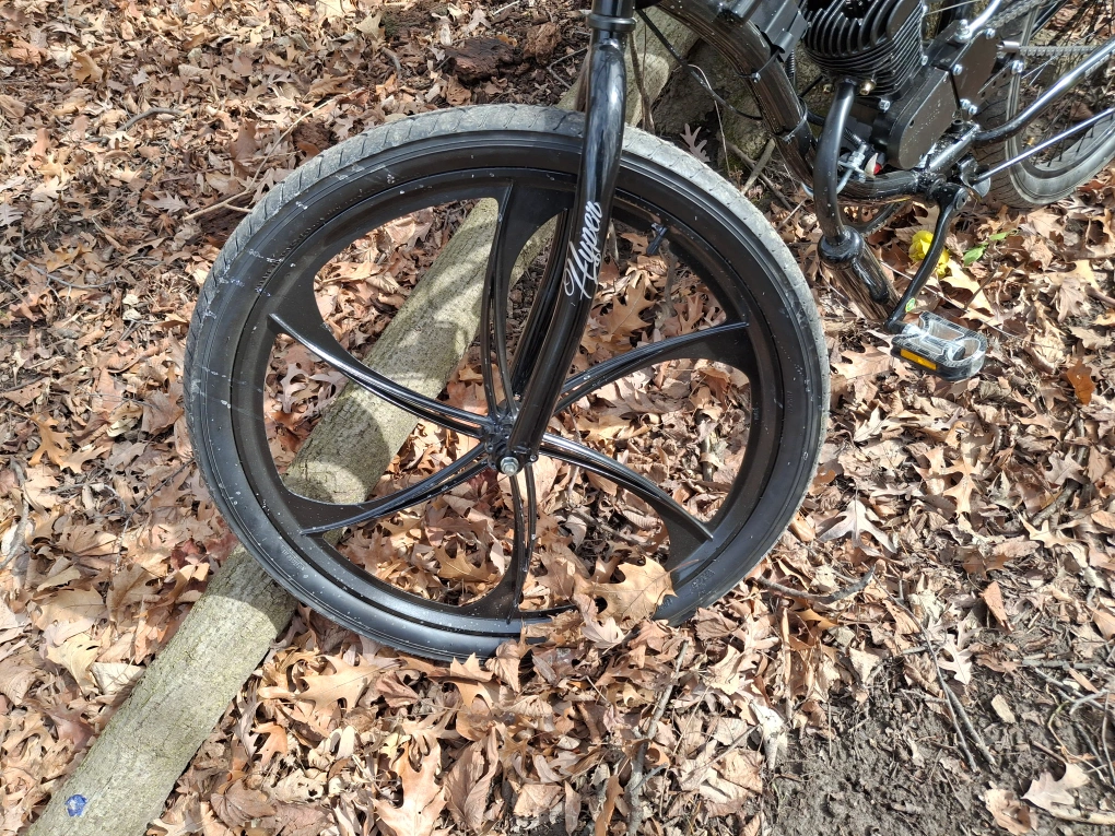 26 inch motorized Cruiser. 2 stroke motor requires gas and oil mixe the gas tank holds 2.4 liters and will give you 55 miles of travel .rear hand brake and coaster brake .no charging required any questions message me . the motor will travel faster after break in is done