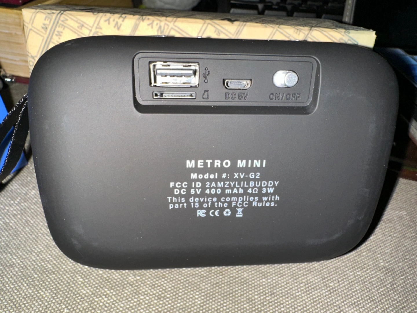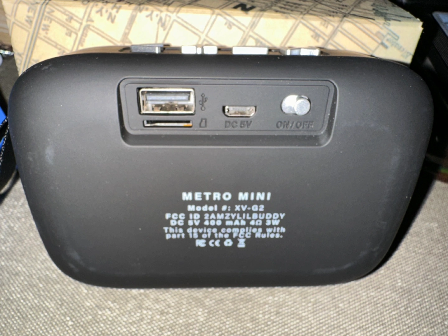 Portable Bluetooth speaker. Small and compact. Features volume controls and power button. USB and DC charging ports. Model # XV-G2.