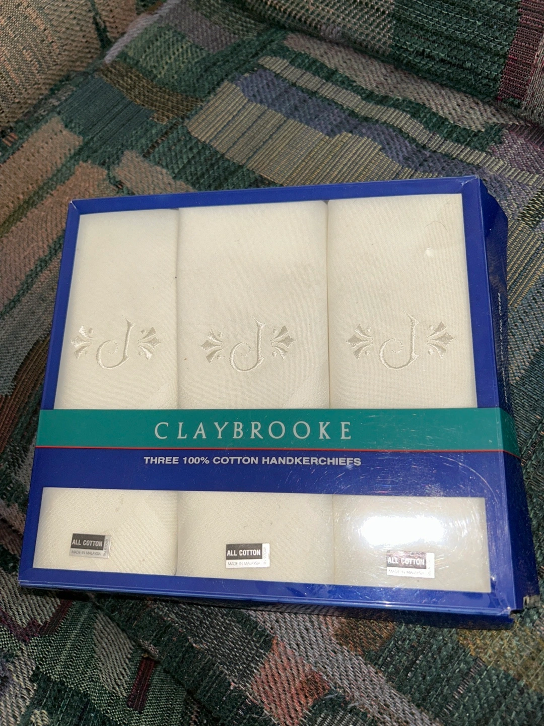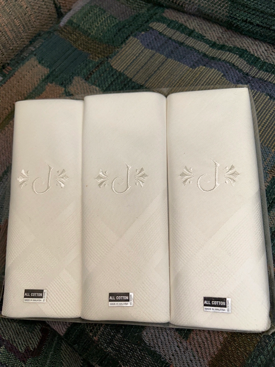 Set of three white handkerchiefs. Embroidered with the letter J. New, in original packaging (box a little broken but handkerchiefs never opened).