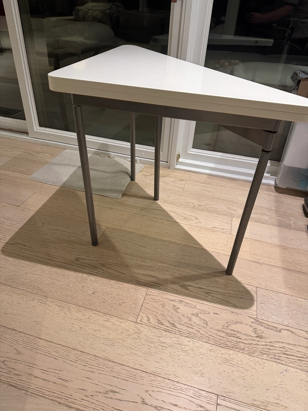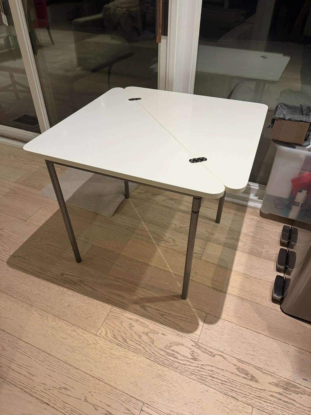 Discontinued ikea folding table. Sturdy and non flimsy. Good to fit A corner and unfolds to square when you need it. It’s discontinued and much sought after.