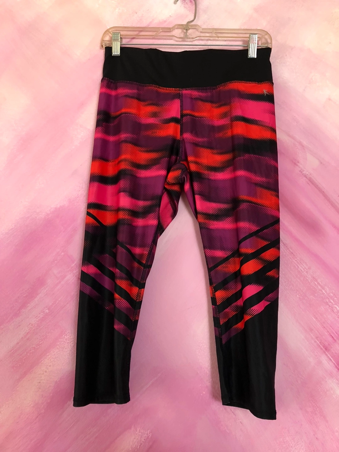 Women's cropped leggings. Pink, orange, and black pattern. Black waistband. Great for workouts.