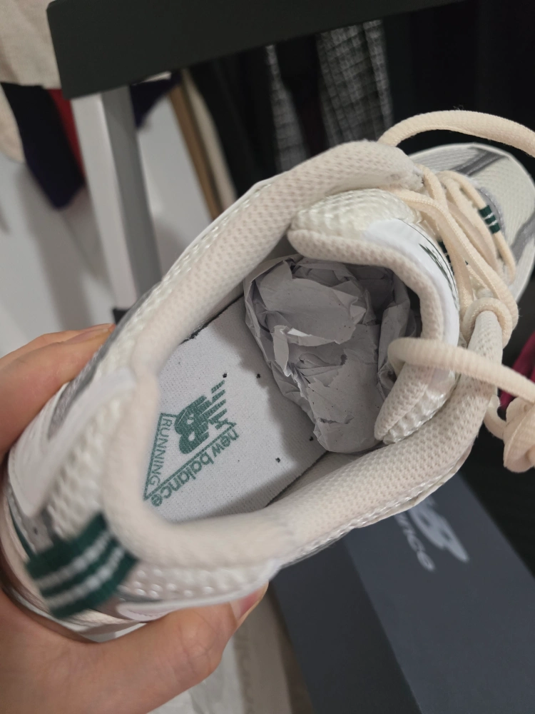 New Balance 530 sneakers. Women's wide. White, silver, and green accents. ABZORB cushioning. Running shoe.