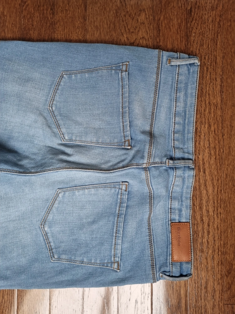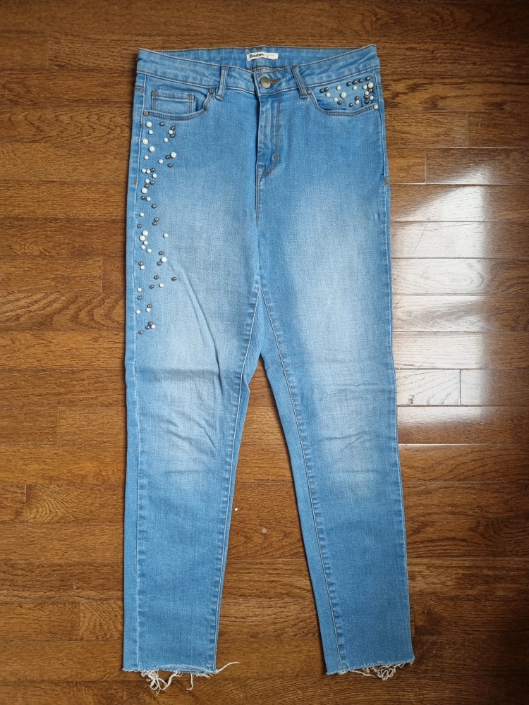 Light wash skinny jeans. Embellished with pearls and studs along the sides. Raw hem detail. Great condition. Pls bring your own bag 😊