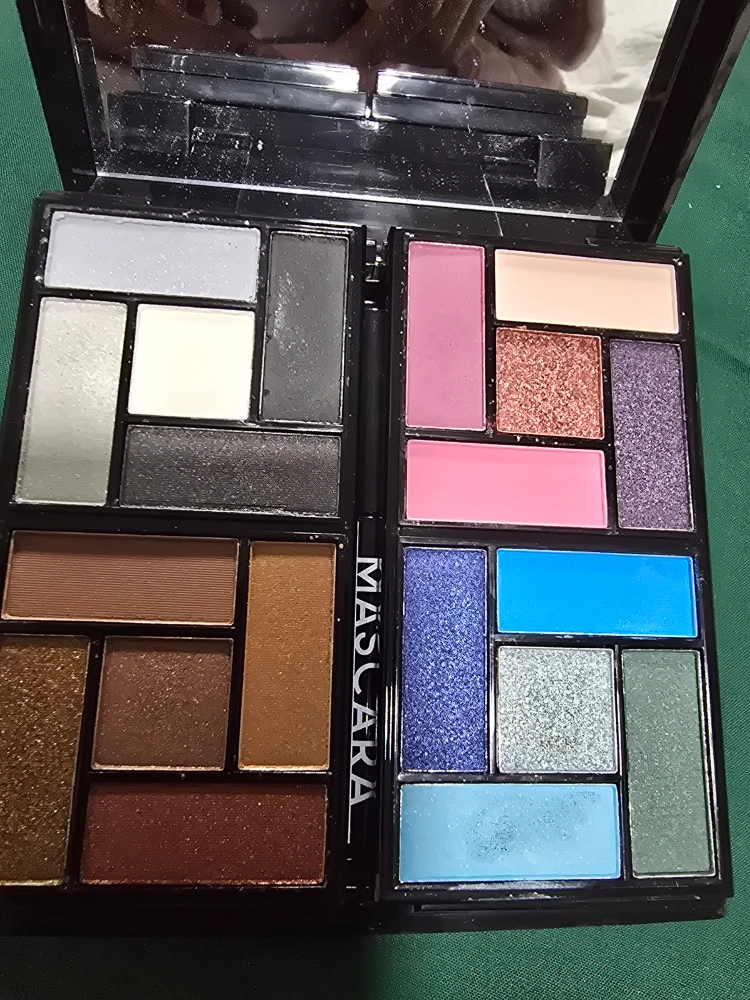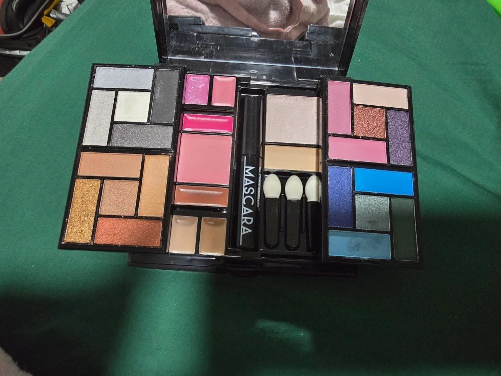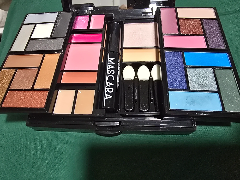 Complete makeup kit. Variety of eyeshadows, blush, mascara, and applicators. Black compact case. Some wear and tear on the case.