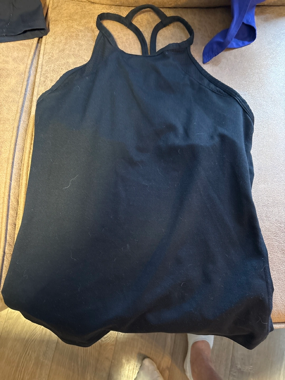 Two athletic tanks. One black, one royal blue. Racerback style with criss-cross straps. Good for working out or casual wear.