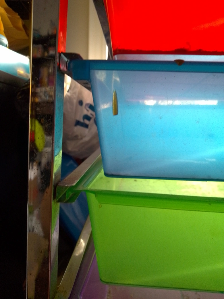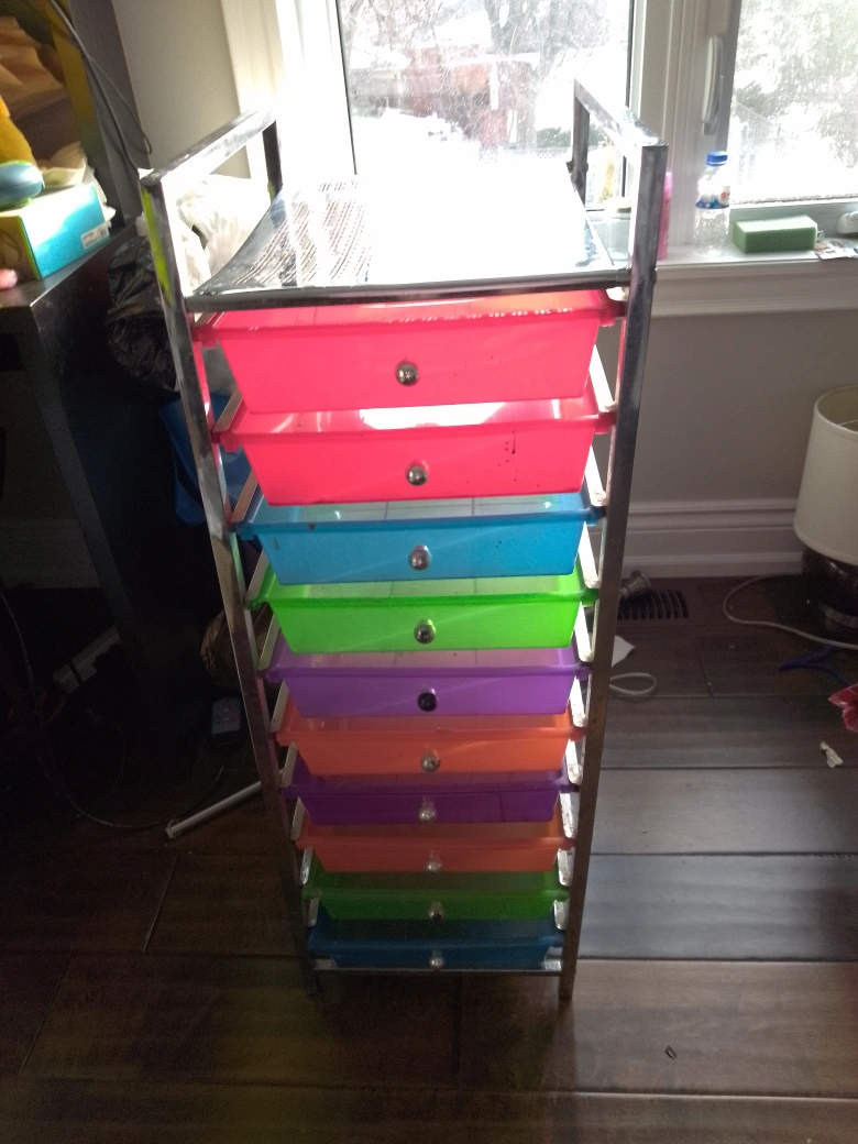 Ten-drawer organizer. Chrome metal frame. Brightly coloured plastic drawers. Great for organizing small items. There is a small breakage on one of the drawers as shown in the 2nd picture. Hence, it's free.
