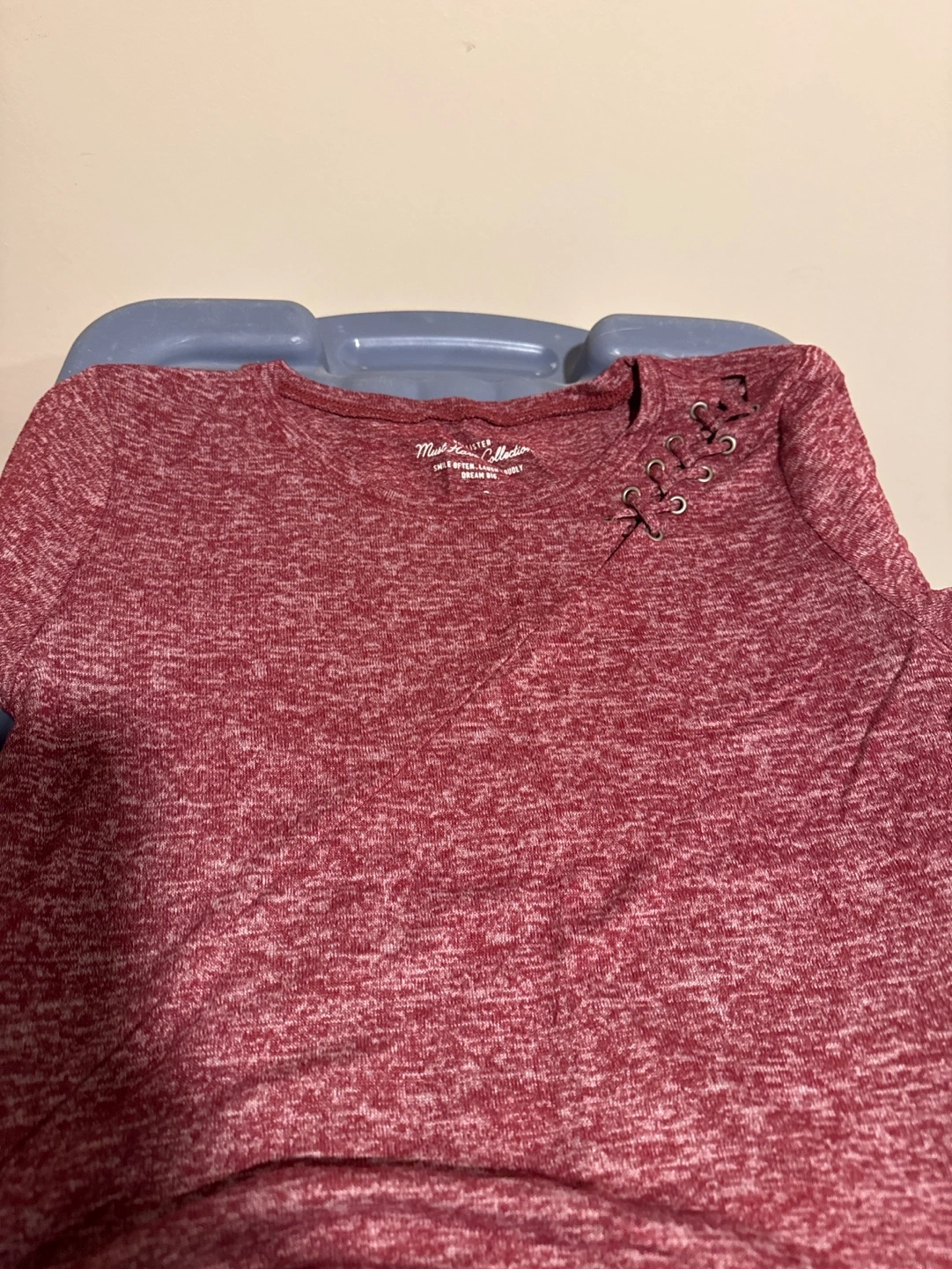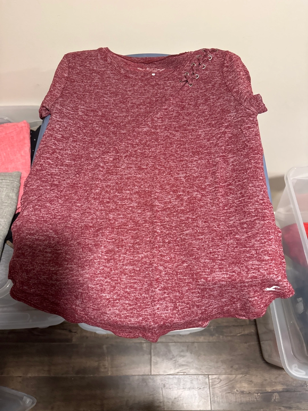 Maroon shirt, size medium. Features a lace-up detail on the shoulder. Short sleeves. Soft material. Hollister Must Have Collection.