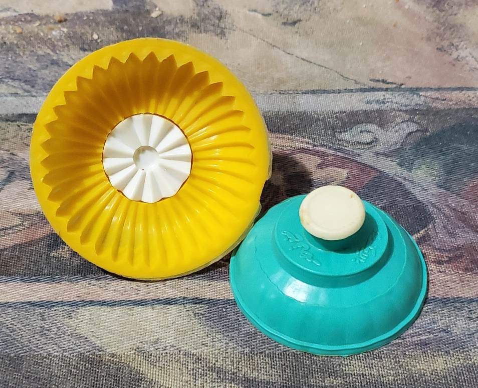 Two-piece vintage plastic mold. Yellow one is bigger with fluted edges. Teal one with small knob. Ideal for baking or crafting.