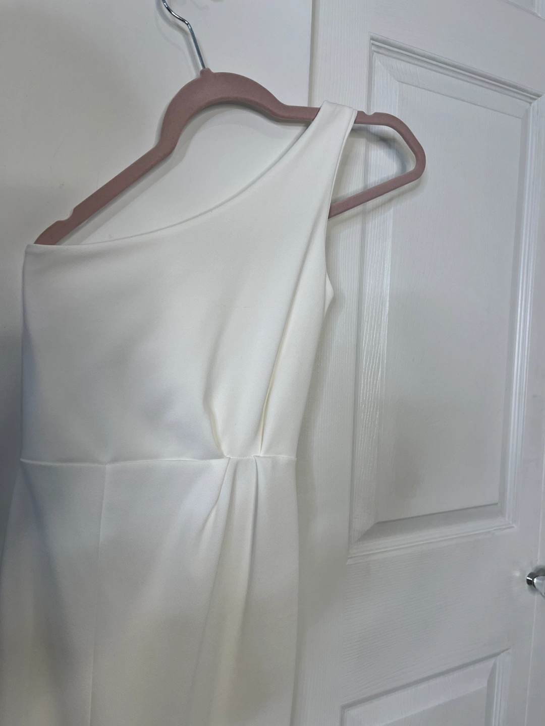 Worn Once- Stunning white maxi dress. One-shoulder neckline, ruched bodice, and a high leg slit. Features a beautiful ruffle detail along the skirt. Floor-length, form-fitting silhouette. Perfect for a special occasion.