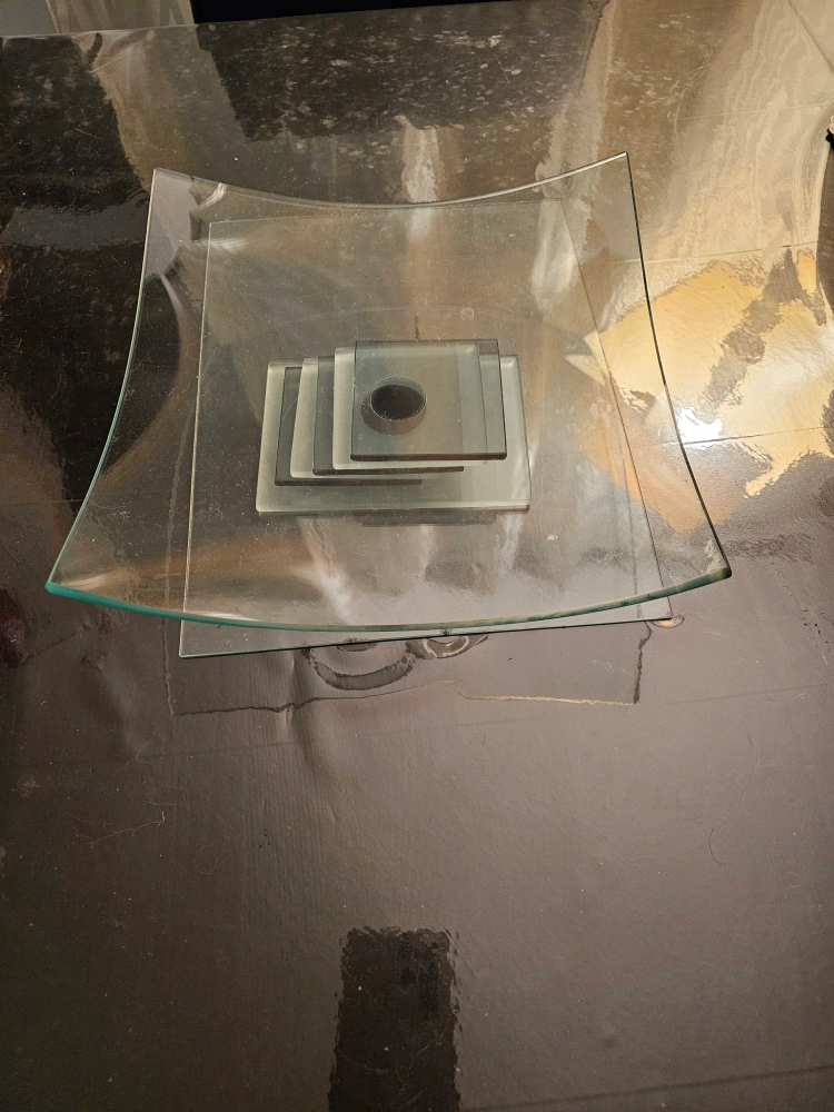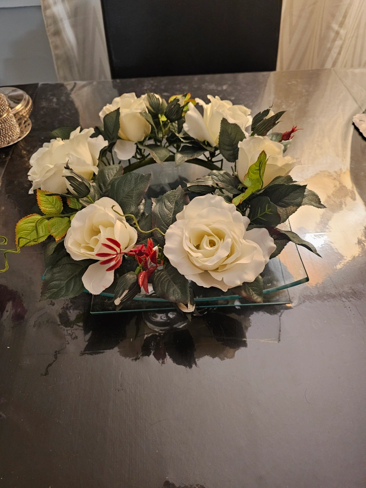 Beautiful glass centerpiece. Features a unique layered glass base and artificial white roses. Perfect for any occasion or home decor. Just add Candles to give your table a sophisticated look
