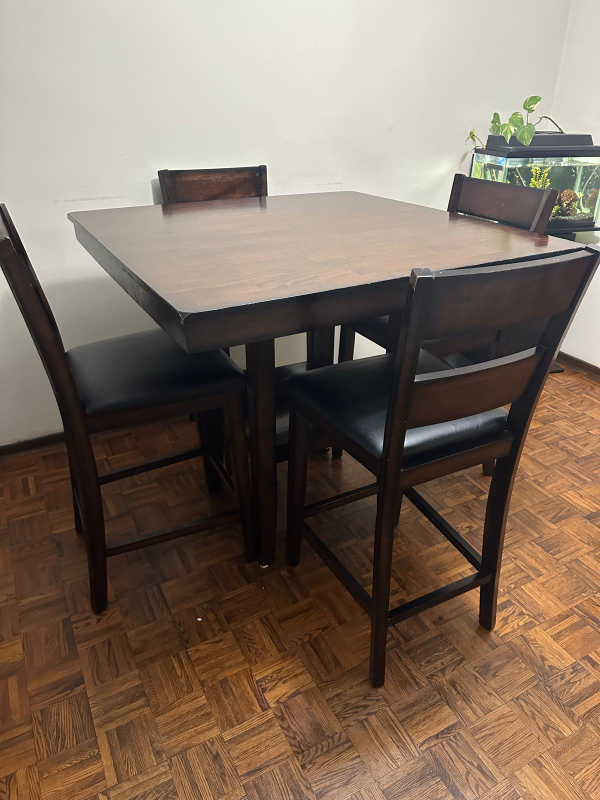 Square counter height dining table and four chairs. Dark brown wood finish. Black vinyl seats. Good condition.
