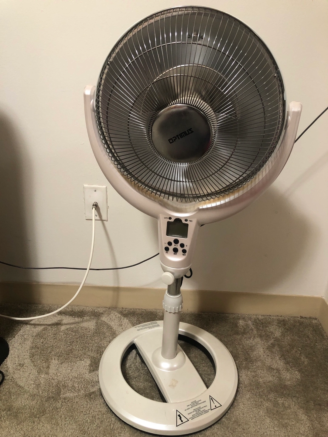 30White and silver infrared heater. Features an oscillating head and digital controls. Adjustable height. Good for supplemental heat.
