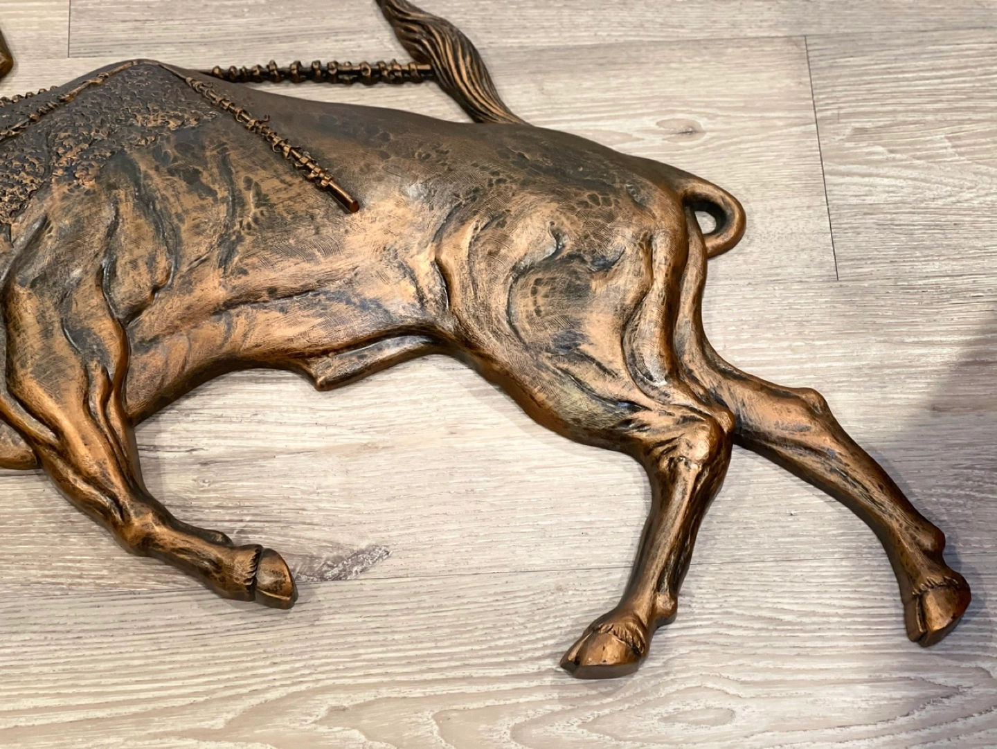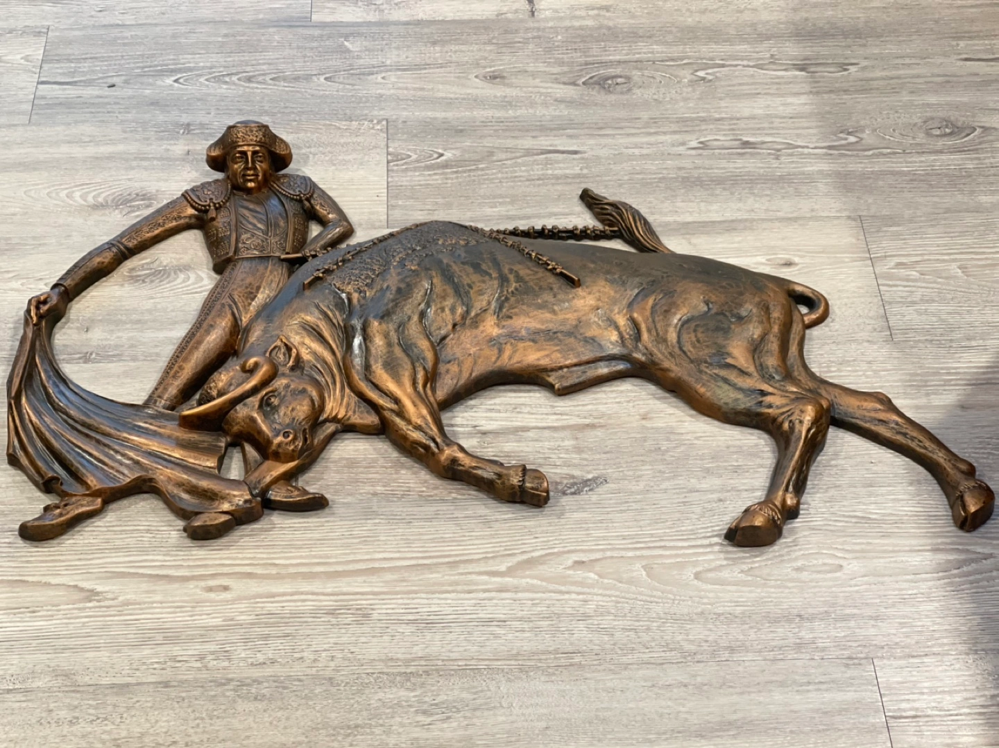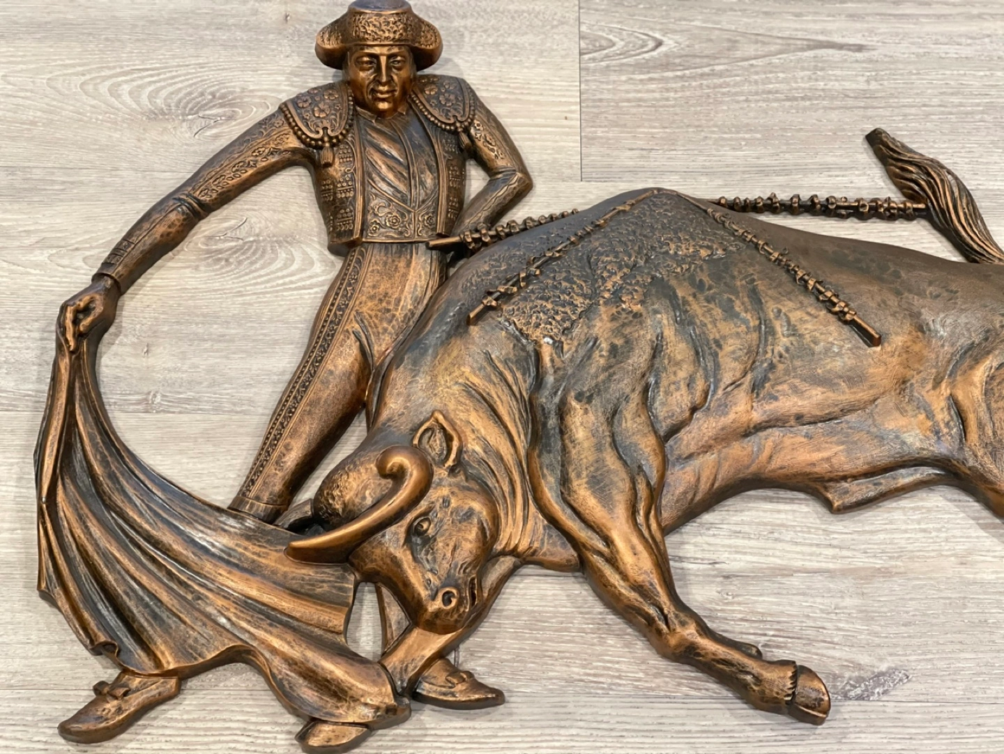 Bronze-coloured wall hanging. Features matador and bull in action. Intricate detailing. Great statement piece.