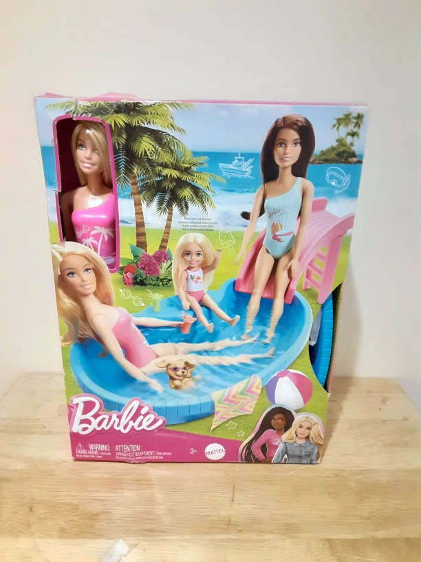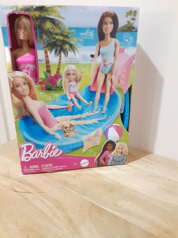 Play out fun in the sun! Barbie doll comes with everything she could need for a perfect summer afternoon: a pool, slide, and accessories.