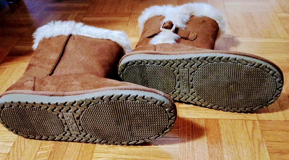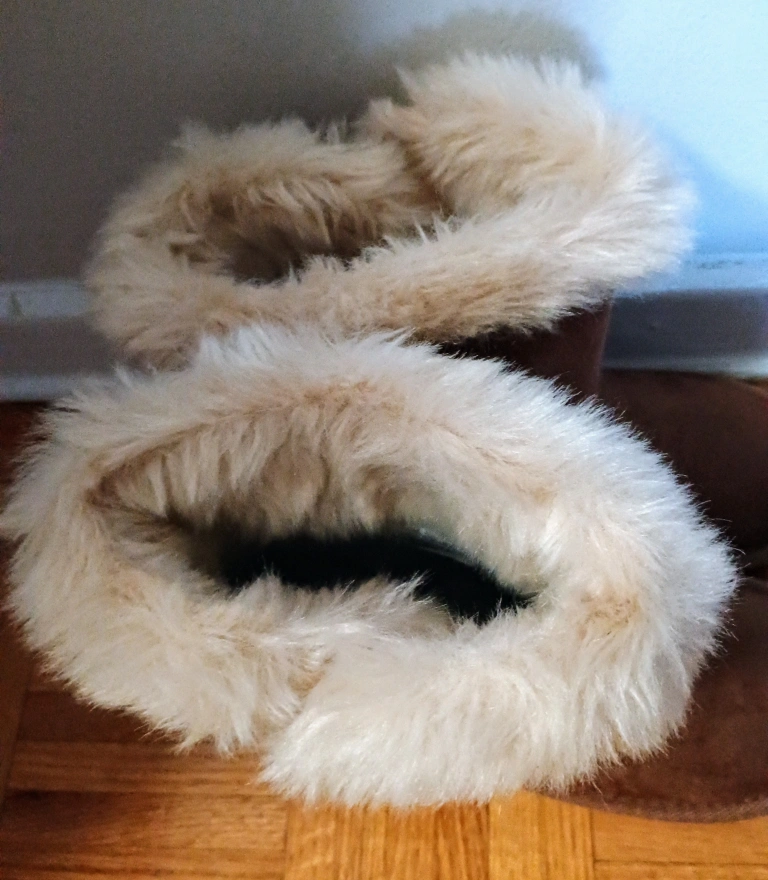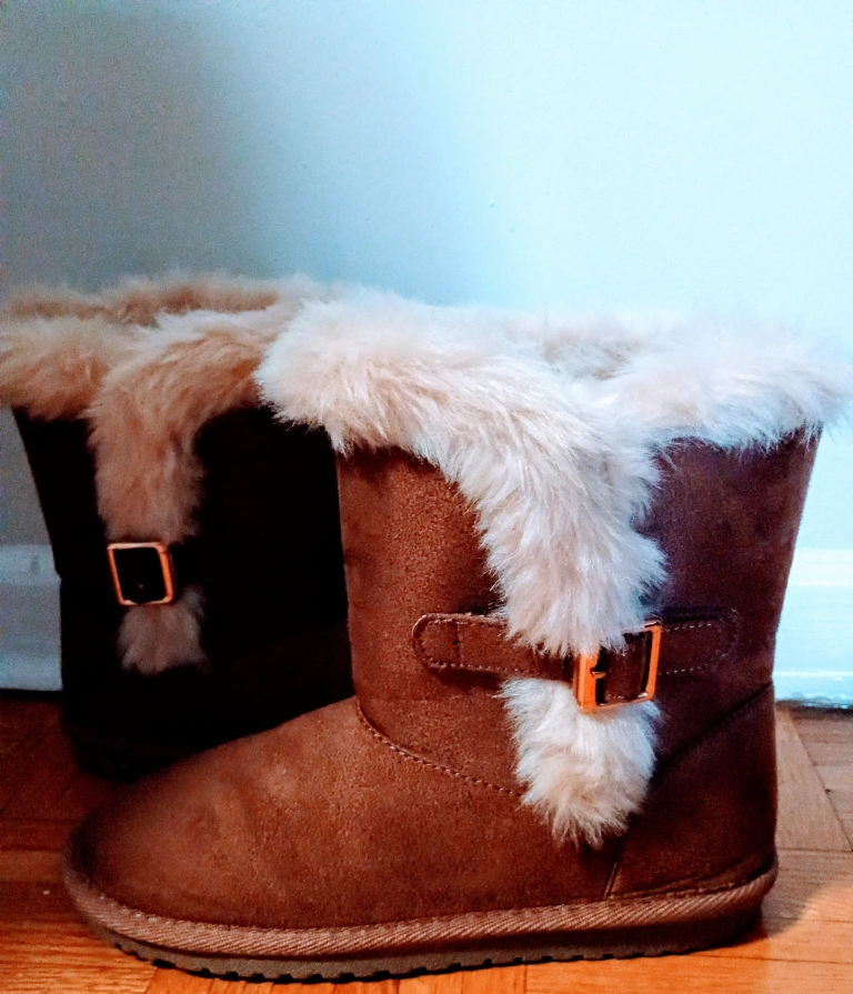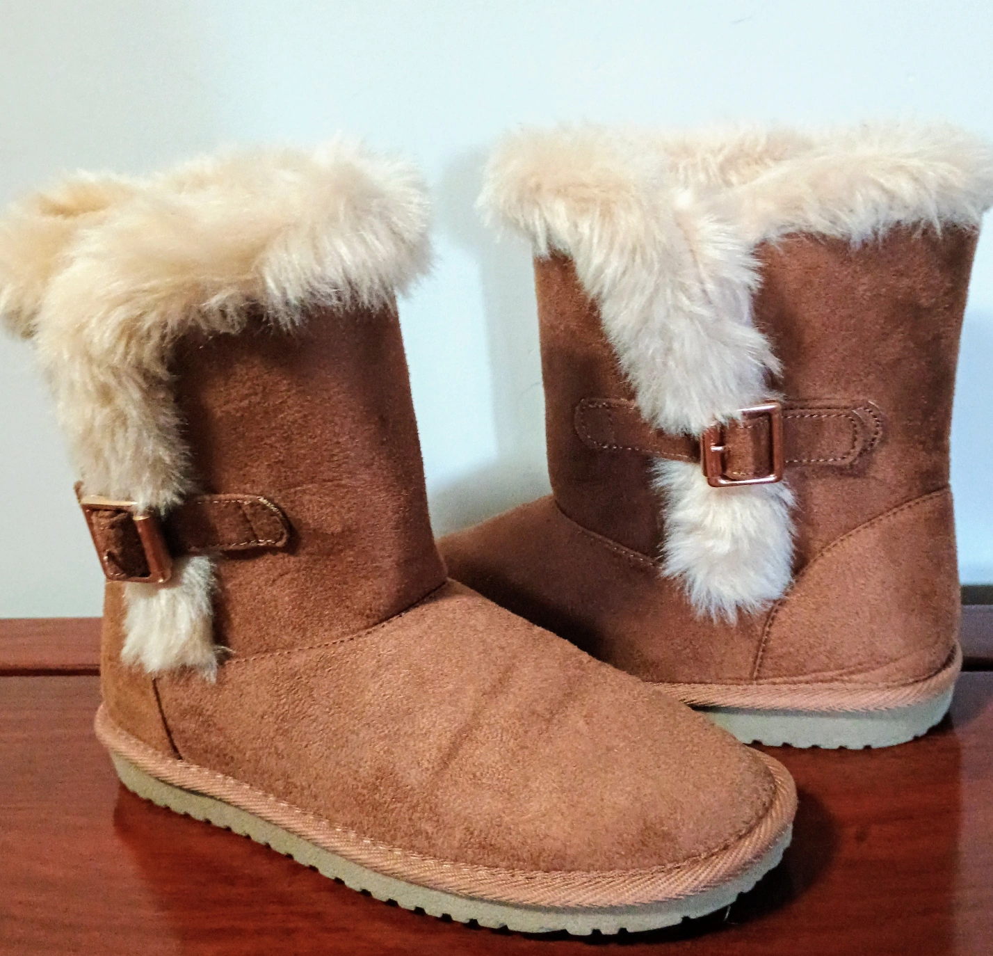 Brown faux suede boot, barely worn . Faux fur trim around the top. Gold Buckle detail. Rubber sole. Warm and cozy. size 4 big kids 8 -10years .lightly used on occasions....cash at pick up at Brookbanks Dr secure lobby.