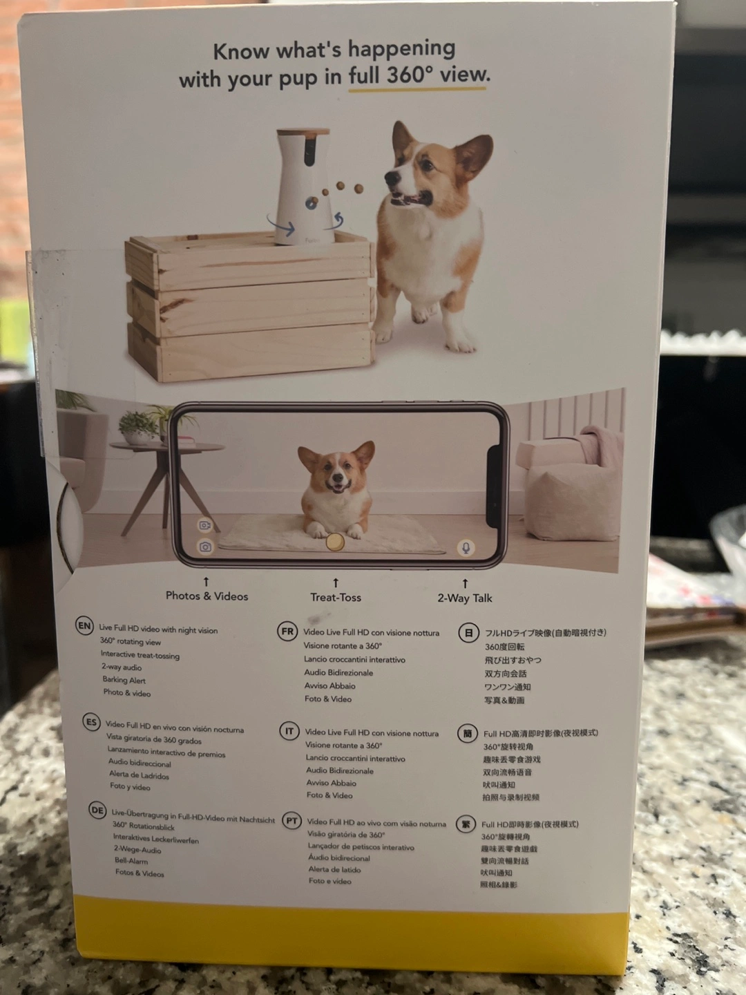 New Furbo dog camera. 360° view. Treat-tossing function. Two-way audio. Live HD video with night vision. Photos and videos.